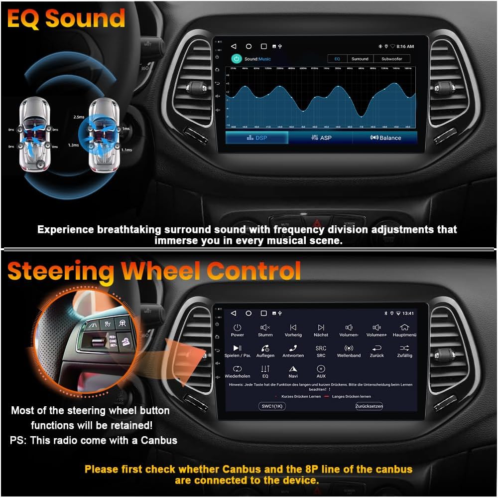 【Steering Wheel Control for Jeep Compass】Supports factory steering wheel buttons, allowing you to adjust volume, switch tracks, or answer calls directly from your wheel. Keep your hands on the wheel while managing music and calls, enhancing safety while driving. Answer or reject incoming calls with SWC buttons, keeping focus on the road. Please note: voice command buttons may not be supported.