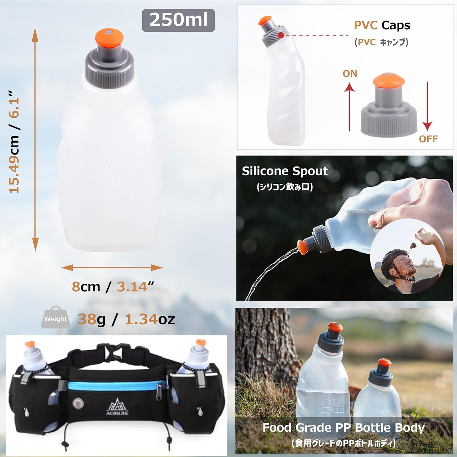 Two 250ml Water Bottles: Made from food-grade PP material, 100% BPA and PVC-free. Featuring a leak-proof push-pull cap, simply bite the nozzle to drink without disrupting your pace. The drawstring closure prevents wobbling or bouncing during sports