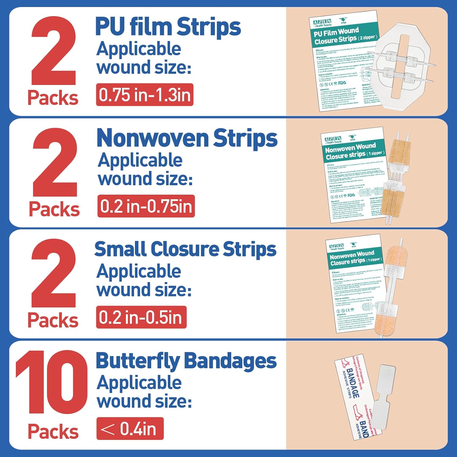 Wound Closure Kit: The laceration closure kit includes all you need to close the wound effectively. It comes with 10 butterfly stitches bandages, 6 emergency wound closures device. All butterfly bandages are individually packed, ensure safety and hygiene