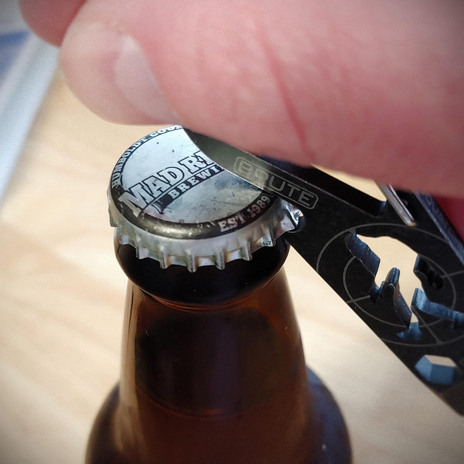 This handy keychain multi-tool features a bottle opener, box opener, carabiner, split-ring, pry and ¼” drive.