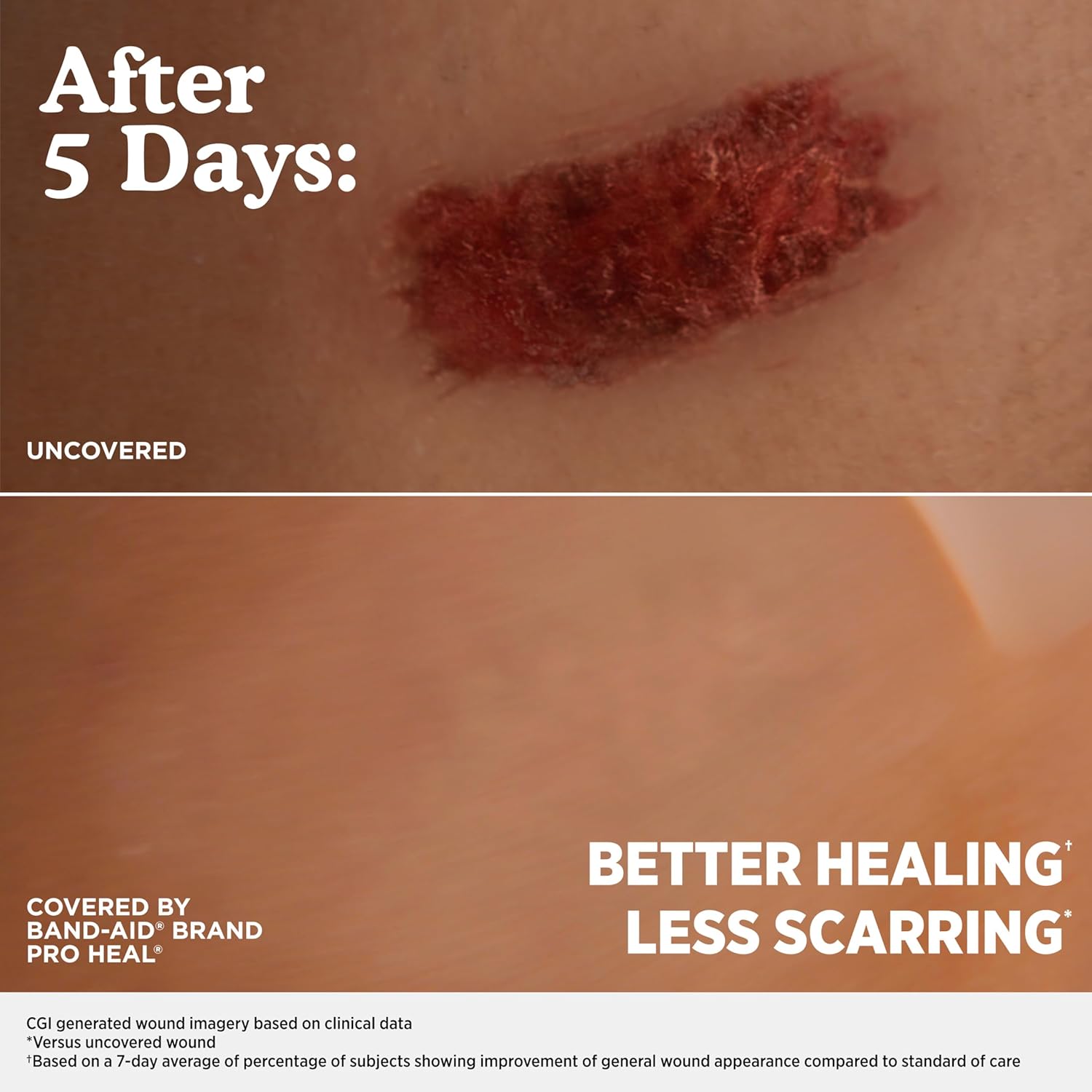 6 count pack of Band-Aid Brand PRO HEAL Advanced Healing Hydrocolloid Bandages for everyday blisters, cuts, and scrapes. Wear for 5 days for less scarring*. Clinically tested to deliver less scarring* and 60 percent better healing**