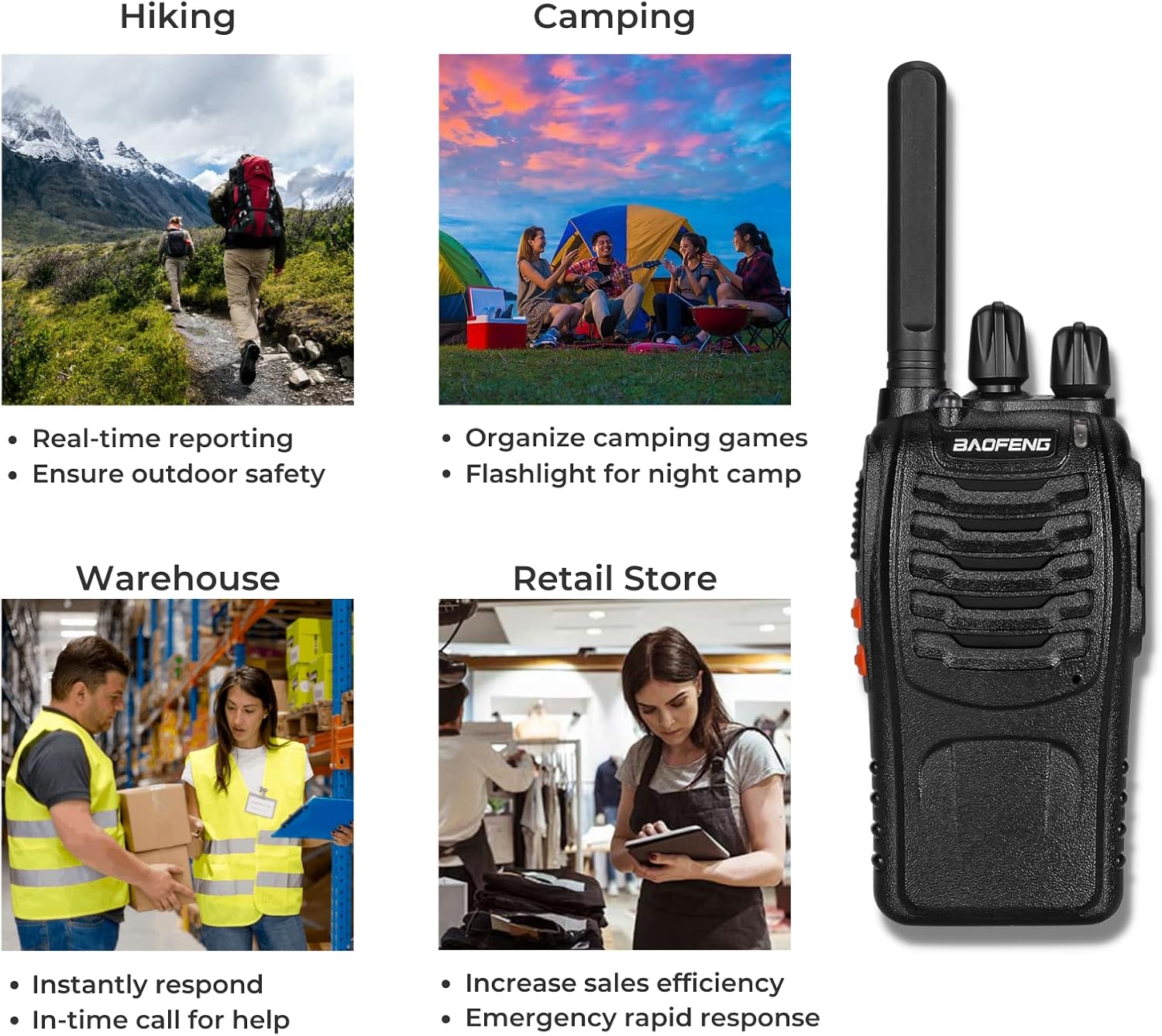 π₯[Hands-Free & Rich Functions] VOX function allows real hands-free operation for the walkie talkies rechargeable. You can activate the function using earpieces when walking or driving. More functions like monitoring, scan, TOT, and LED torch. Supports CHIRP.
