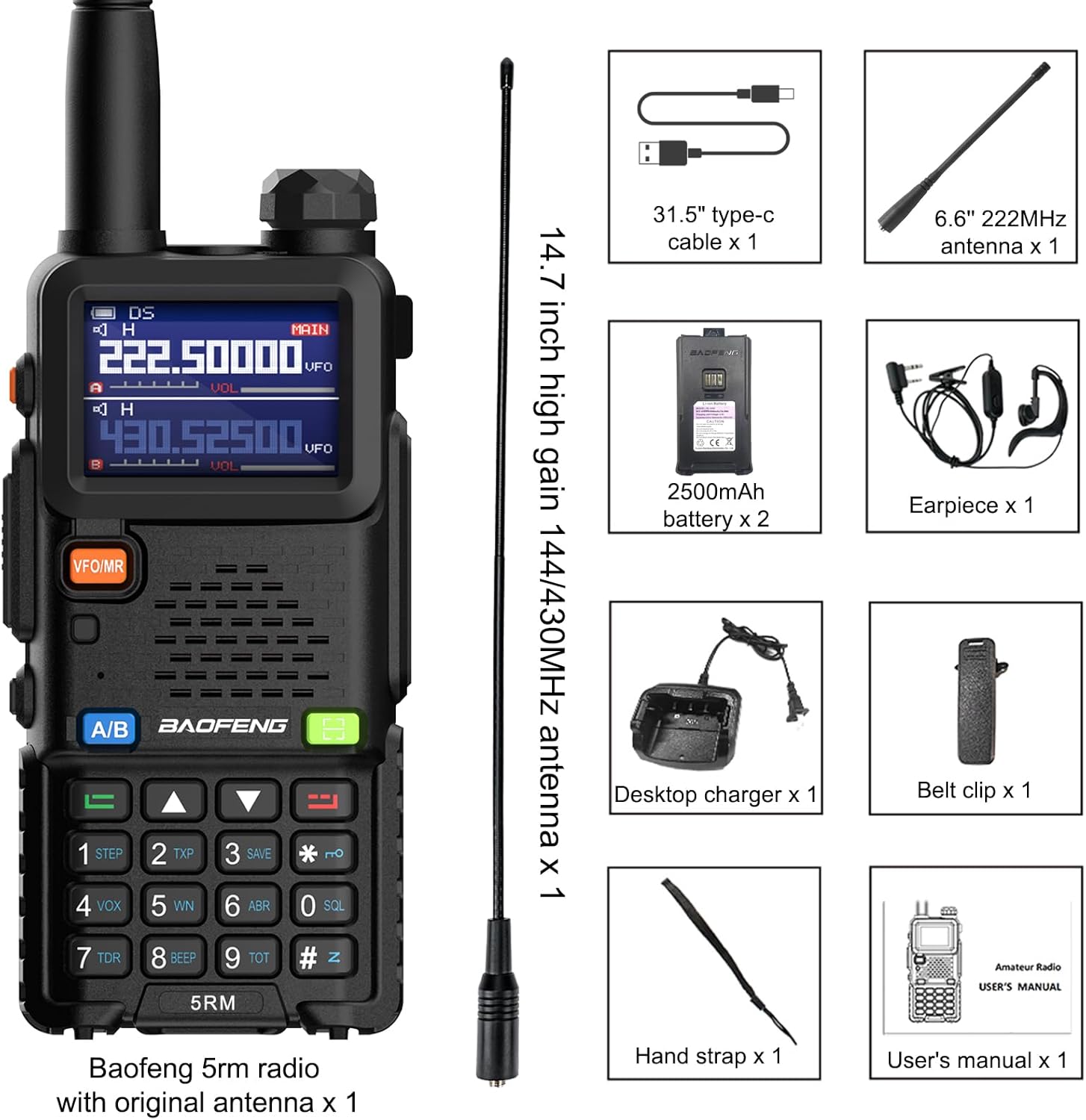 5RM radio standard + 14.7 inch high gain 144/430MHz antenna + 6.6 inch 222MHz antenna + 31.5 inch type-c cable + Rechargeable 2500mAh battery.