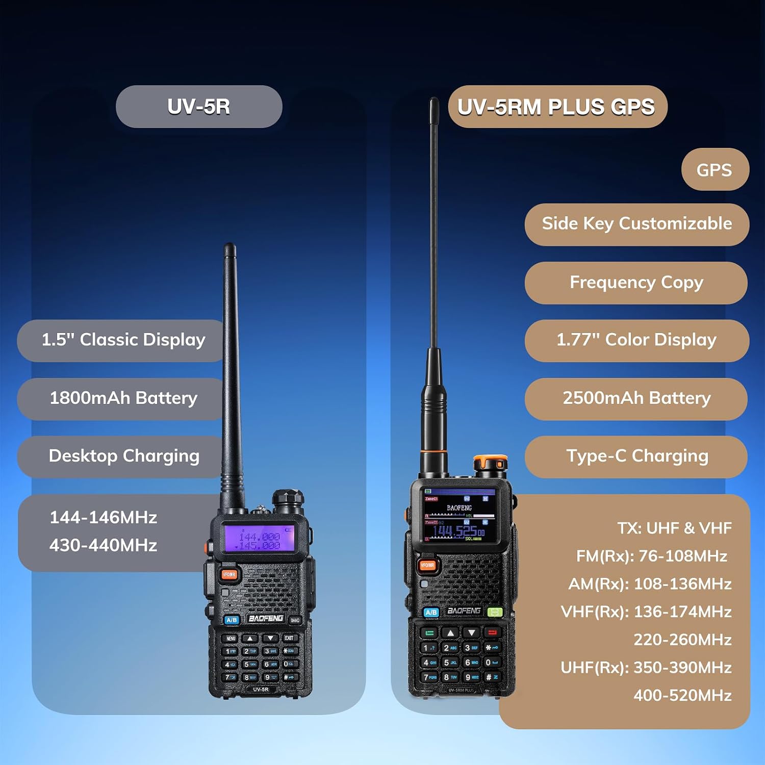New Version: UV-5RM PLUS GPS brings you ① expanded frequency coverage, including Airband, FM, and NOAA bands, ② GPS functionality, ③ one-key frequency copy, ④ a 2500mAh battery with USB-C charging, ⑤ 10W power output, and ⑥ a larger 1.77” color display for improved readability. FCC ID: 2AJGM-5RHPRO