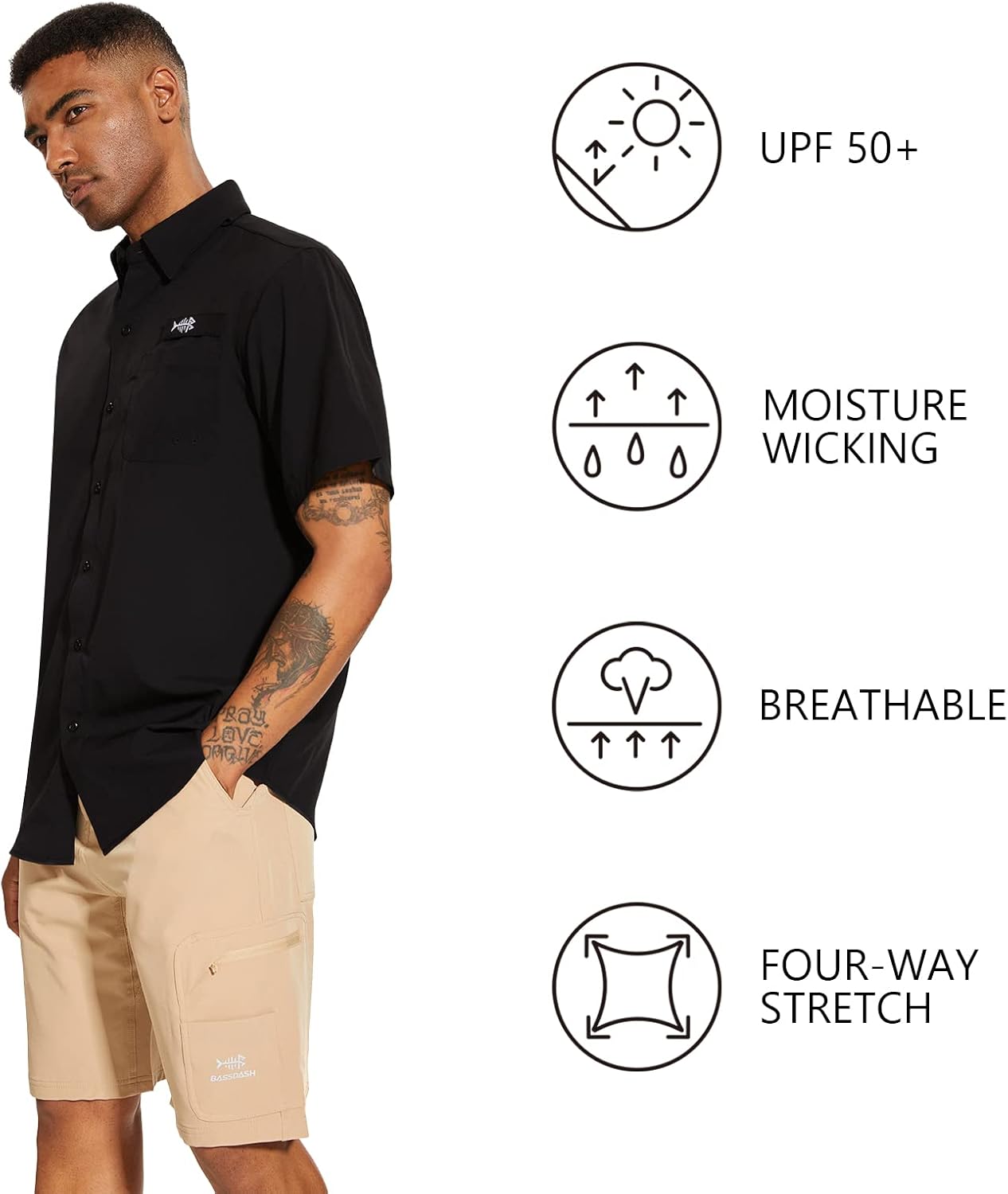 The video showcases the product in use.The video guides you through product setup.The video compares multiple products.The video shows the product being unpacked. BASSDASH Men’s Short Sleeve Button Down Shirt Merchant Video