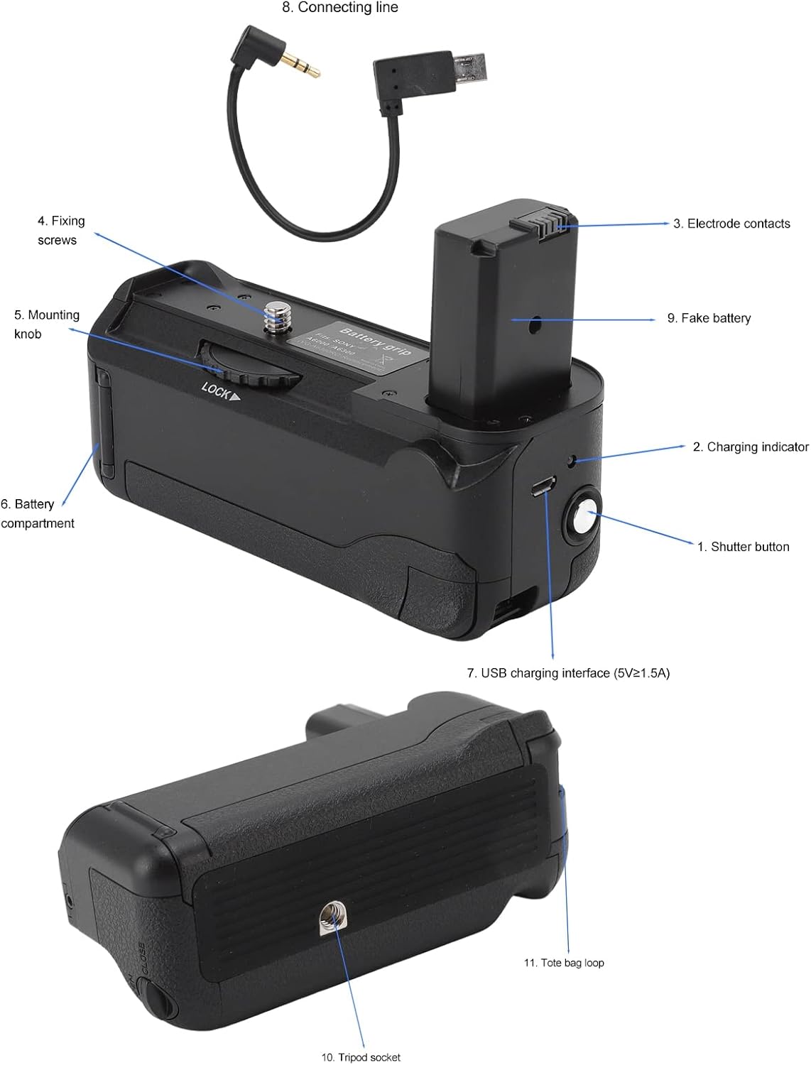 [Charging Interface] : Includes external charging interface for direct battery charging.[Conductivity] : Skin shape technology for comfortable grip, high purity copper contacts for stable information .[Shutter ] : Equipped with an inline shutter for convenient vertical shooting.[Battery Life] : Accommodates 1 or 2 np fw50 batteries, doubling capacity and extending shooting time.[Compatible] : Fully compatible with a6000 a6300 a6400 a6100 a6500 cameras, featuring a 1/4in screw hole for tripod attachment.Spec:Item Type: Battery GripGross Weight: 248g/8.7ozMaterial: ABSApplicable Cameras: For A6000 A6300 A6400 A6100 A6500Battery: 1PC or 2PCS NP FW50 batteries, shipped without batteriesCharging Time: 1 battery about 3 hours, 2 batteries about 6 hours, test conditions: charging voltage 5V, charging current 1.5APackage List:1 x Battery Grip1 x Shutter Cable1 x ManualHow To Use:Camera installation:1. Turn off the camera power and remove the battery from the camera.2. Remove the dummy battery from the handle and put the dummy battery into the camera battery compartment and cover the battery compartment cover.3. Align the dummy battery with the handle connection port, align the handle fixing screw with the camera screw hole, and fix the handle to the camera through the mounting and dismounting knob.Note:1. When charging, please remove the handle from the camera, do not use the handle while charging, otherwise it may damage the handle or the camera.2. When plugging in the external power supply, the indicator light flashes alternately in red and green during charging, indicating that there is no battery in the battery drawer of the handle, please insert the battery.