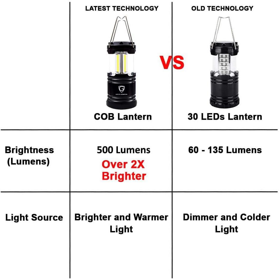 BRIGHTEST LANTERN FOR ITS SIZE: NEW COB LED technology illuminates more area with more light than the 30 LED lanterns commonly found on Amazon. It’s light is also warmer in color than the competition’s 30 LED lanterns, eliminating that cold, harsh feel. This COB lantern packs more brightness into its compact size than ANY other lantern, making it over 2X brighter than the 30 LED lanterns commonly found on Amazon.CE & ROHS Approved Military Grade Material – the Best Camping Lantern Flashlight Survival Gear & Camping Equipment & Emergency Light & Halloween Light & Outdoor Lantern made with the highest standardsUses 3 AA batteries (AA batteries not included)Up to 12 hours of regular, continuous useWater-resistant to withstand weather conditions and collapsing brightness control