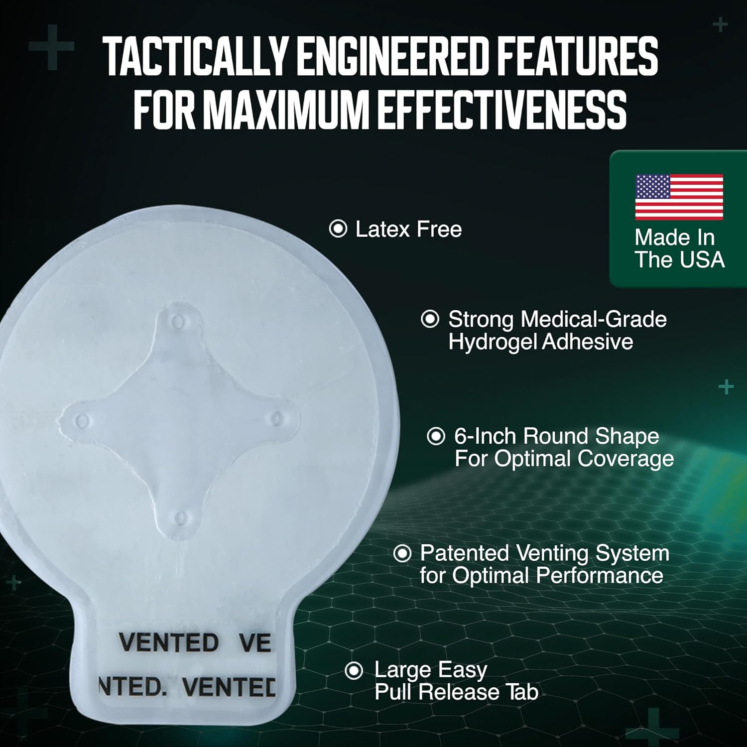 Patented Venting System: This vented chest seal allows for a one-way airflow out of the chest cavity while preventing airflow into the chest cavity. The patented venting system allows for proper ventilation even in the event of an obstruction.
