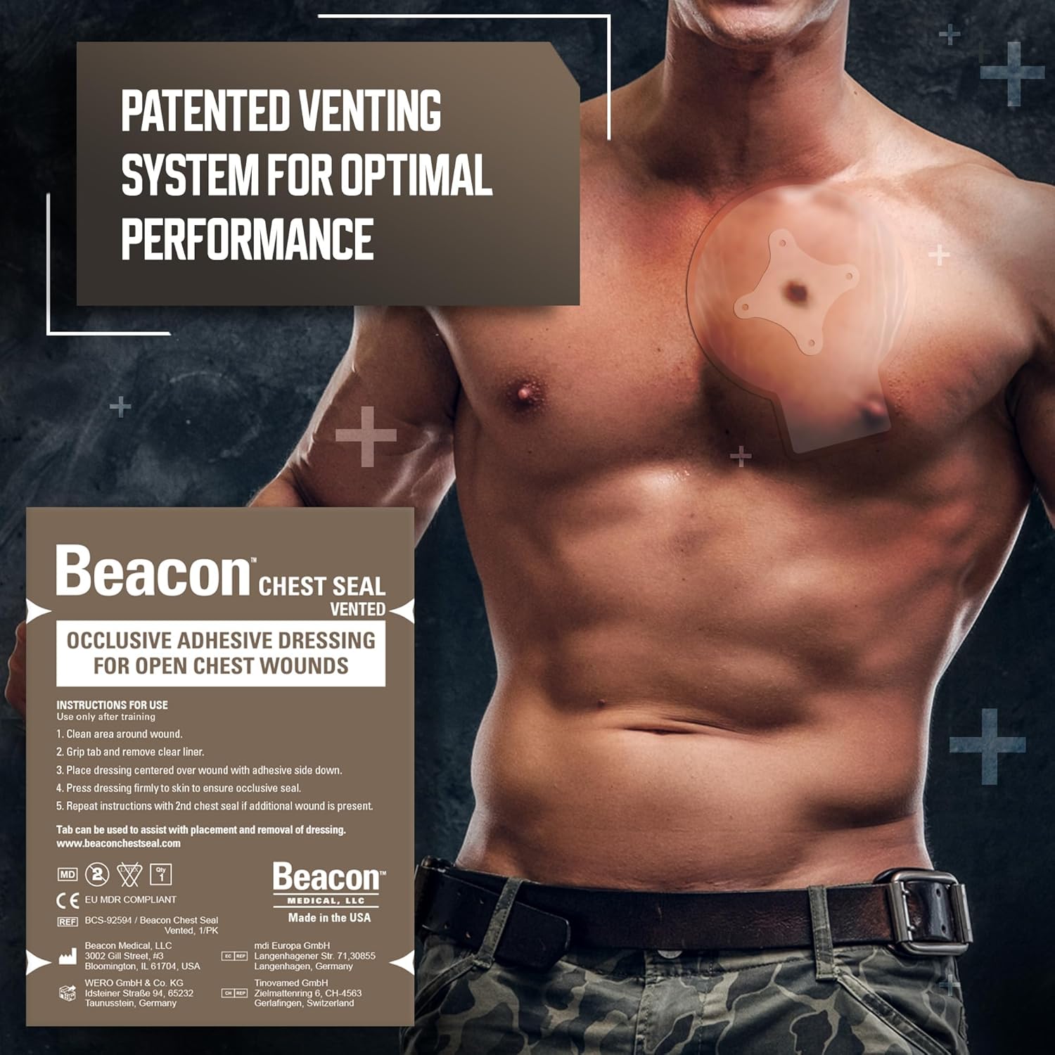 Made in the USA; EU MDR Compliant CE Mark: The Beacon Chest Seal meets CoTCCC preferred features for chest seals. Our patented vented chest seal has received CE Marking and is compliant with regulations for medical devices in the USA and Europe Union.