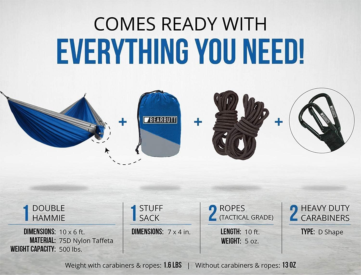 PLENTY OF ROOM – The Bear Butt travel hammock has so much room for Two people to fit comfortably and with a legal weight capacity of 500lbs you can enjoy time with loved ones hammock camping. Get Yours Now.