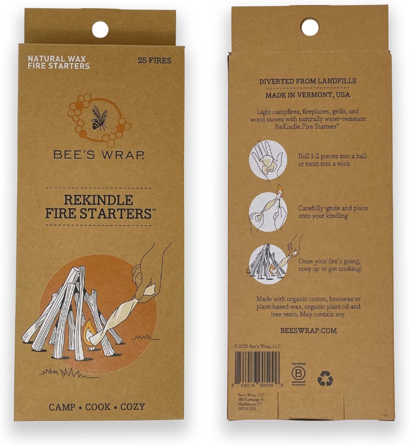 EASY IGNITION: roll a few pieces into a ball or twist, light, and place on kindling; enjoy a long, slow burn with little smoke. Each pack of fire starters starts 25 fires & includes a variety of Bee’s Wrap patterns.