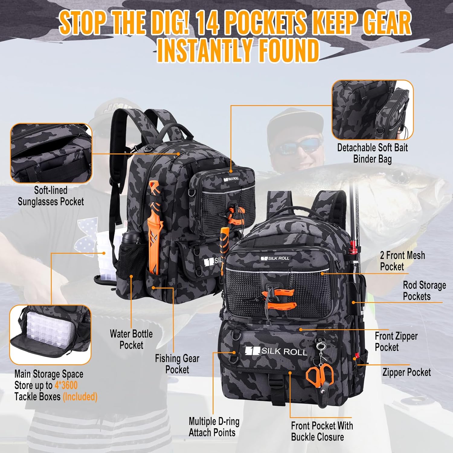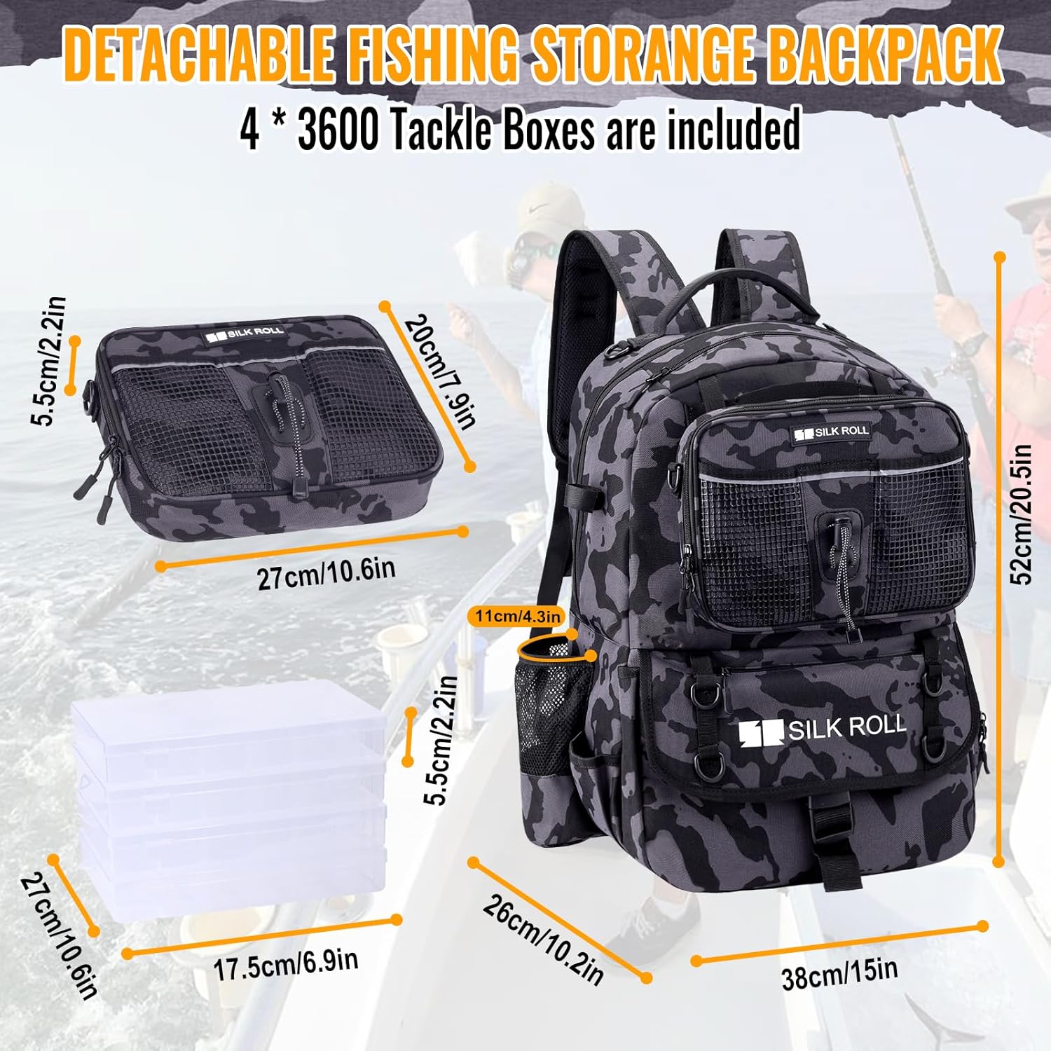 All-in-One Fishing Tackle Organizer: The SILK ROLL 50L large fishing backpacks can store rods, reels, lines, and accessories effortlessly, comes with a detachable soft bait binder tackle bag that includes six clear sleeves (9.4” x 7.3”) for quick identification of your baits. Eliminating the need for multiple bags and keeping your gear secure during long trips.