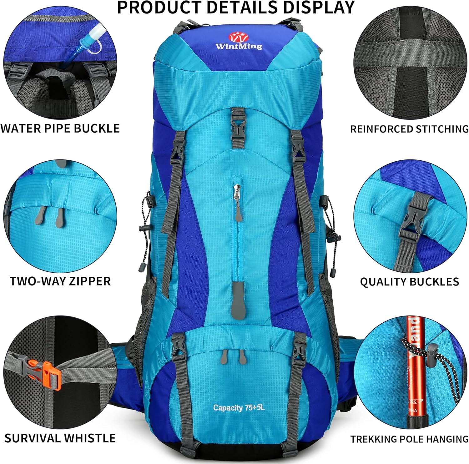 【Waterproof Hiking Pack】The 75L hiking daypack size is 30*10*12 inch, camping bag made of waterproof nylon material, high quality and smooth zippers, backpacker backpack with rain coveron bottom pocket can protect your stuff from the heavy rain, multi-functional hiking backpacking packs for men and women.