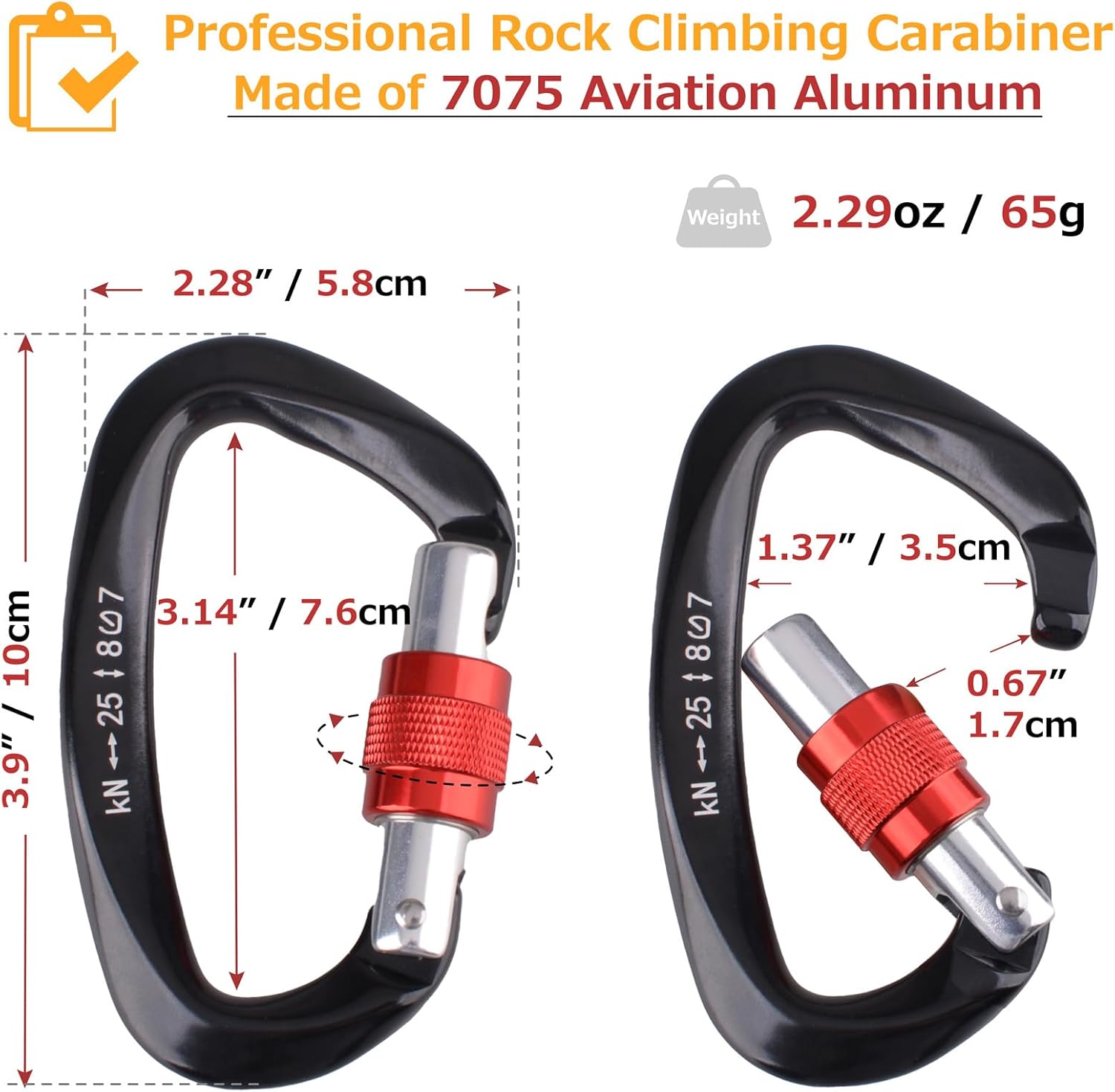 Size: Rock climbing carabiners (3.93” x 2.2”) with 0.67” gate opening. The heavy duty carabiner features D-shaped ergonomic design for smooth one-handed operation, ideal for quick locking during climbs