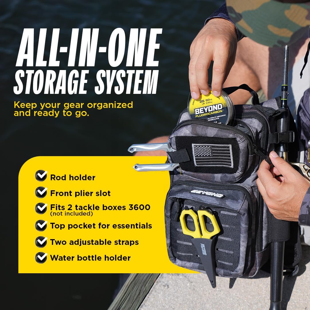 ALL-IN-ONE STORAGE- The main storage compartment fits 2 x 3600 sized tackle boxes, the top pouch fits your phone and keys perfectly with no room to spare, features a rod holder, bottle holder, pliers holder, a medium size pocket for leader spools, and smaller front pocket for whatever else you need! It carry it ALL!