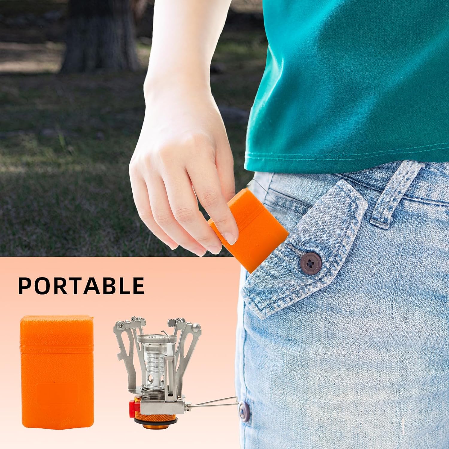 Camping Cookware Kit:Includes 1 x Mini Stove + Storage Box, 1 x Stove Stand, 2 x Aluminum Nonstick Cookware, 1 x Spoon and Fork + 1 x Cutlery Storage Bag, 1 x Stainless Steel Cup + 1 x Silicone Mug Protector, and 1 x Portable Nylon Set Bag.