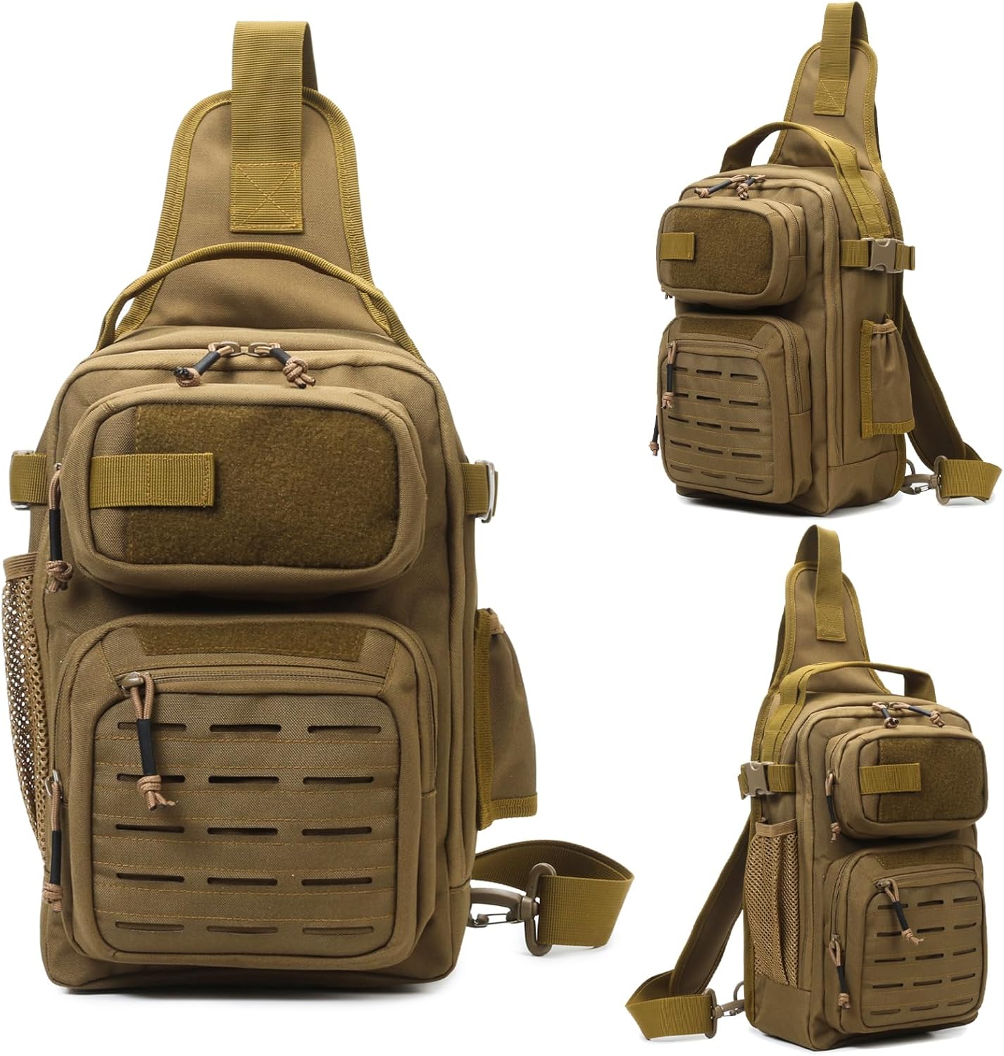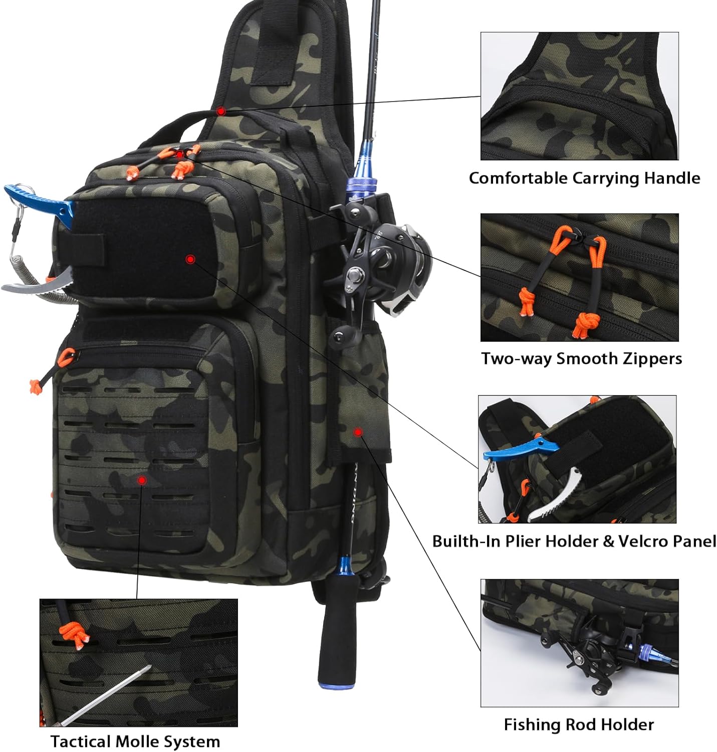 Utility Design: Fishing Sling Backpack use two-way zippers on main compartment , with 180-degree opening design make it reliable and convenient to operate. Built-in Plier Holder on the front pocket allows for quick plier access to remove hooks. Velcro panel on the front of Fishing Sling Backpacks for attaching your favorite patches. Fishing Rod holder on the left side and equipped with a flexible buckle to help secure the rod so that free your hands.