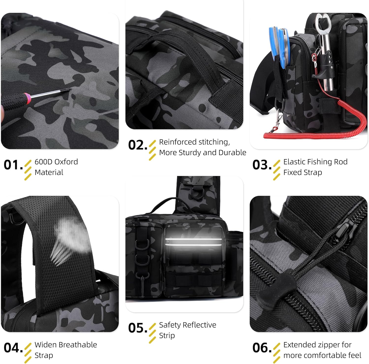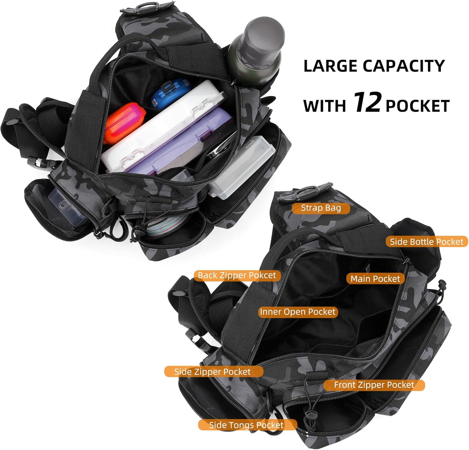 【Waterproof & Durable】 Made of 600D water-resistant oxford, this tackle bag withstands harsh outdoor conditions, protecting your fishing essentials from rain and splashes