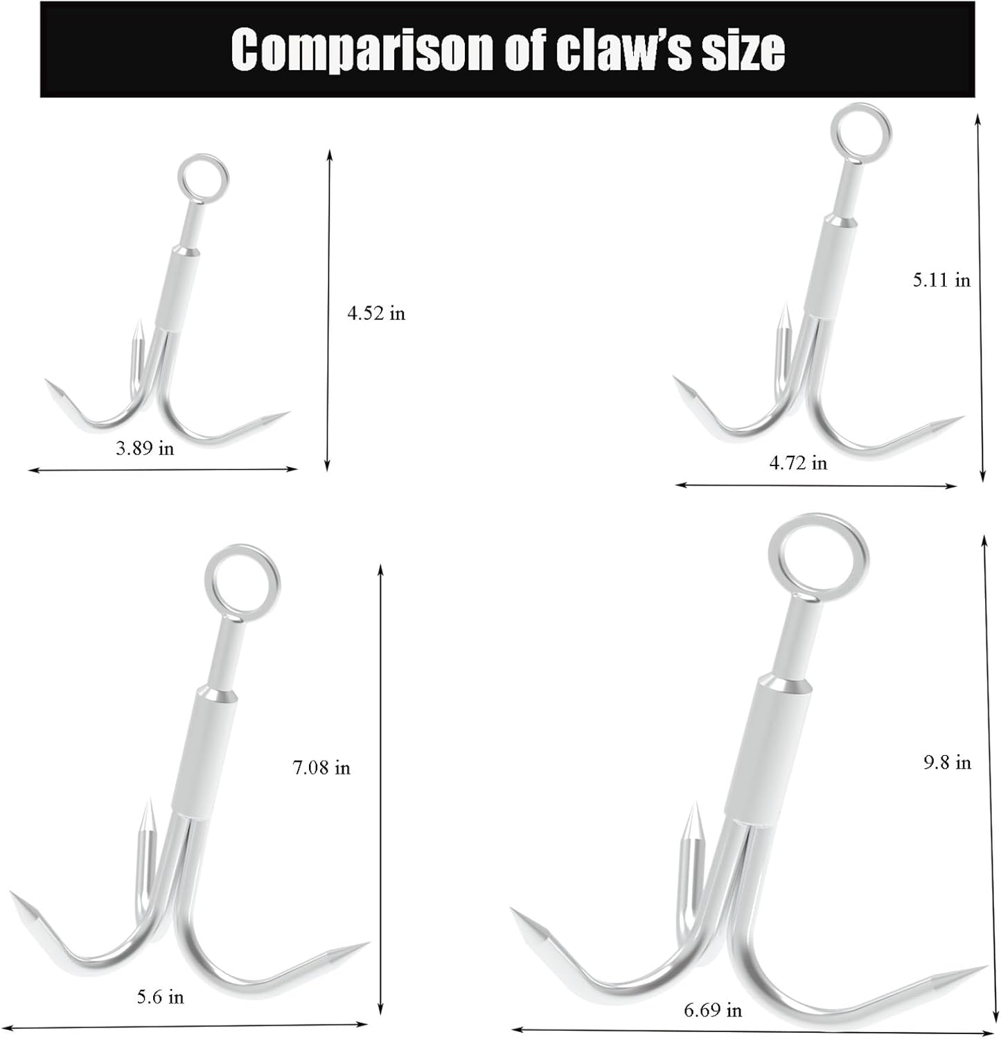 【Grappling Hooks】 This 3-claw stainless steel grappling hooks is a must adventure tool for outdoor activities. The diameter of the grappling hooks is : Small grappling hooks: 3.89 in diameter and 4.52 in height, Middel grappling hooks: 4.72 in diameter and 5.11 in height,Big grappling Hooks: 5.6in diameter and 7.08 in height, Max grappling hooks: 6.69 in diameter and 9.8 in height. You could use the grappling hook more easily.
