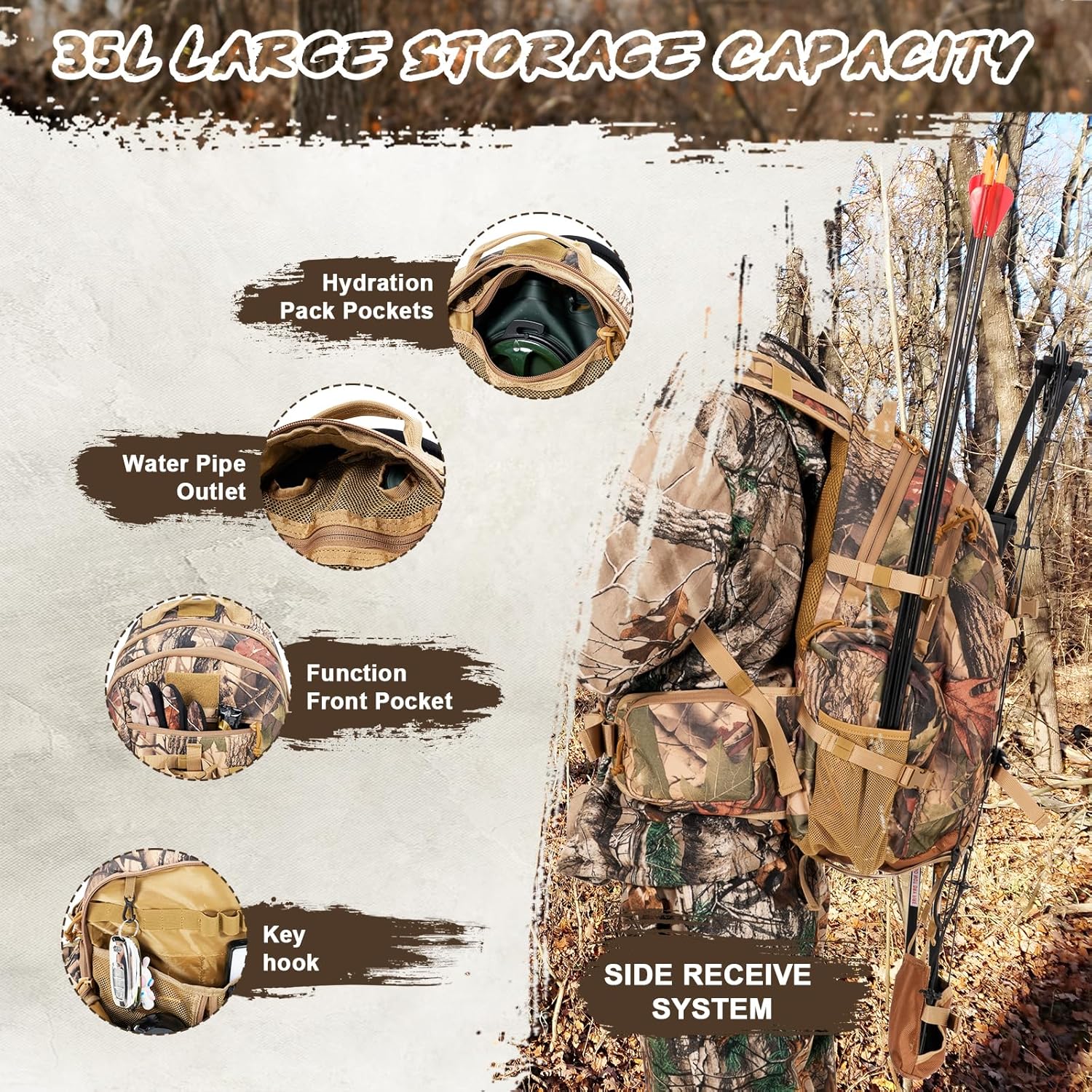900D Durable Hunting Backpack for Men: High-density polyester fabric makes several trips in thick brush without tearing or scratching. This noise-reducing material also makes it hard for prey to detect you at close range. Additionally, smooth quiet zippers with pull tabs and reinforced stitching for enhanced durability.