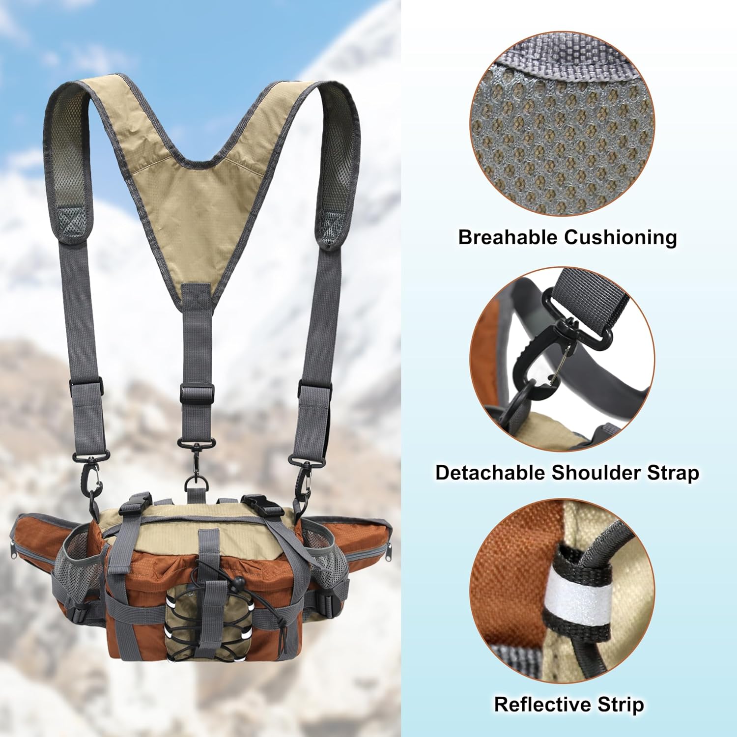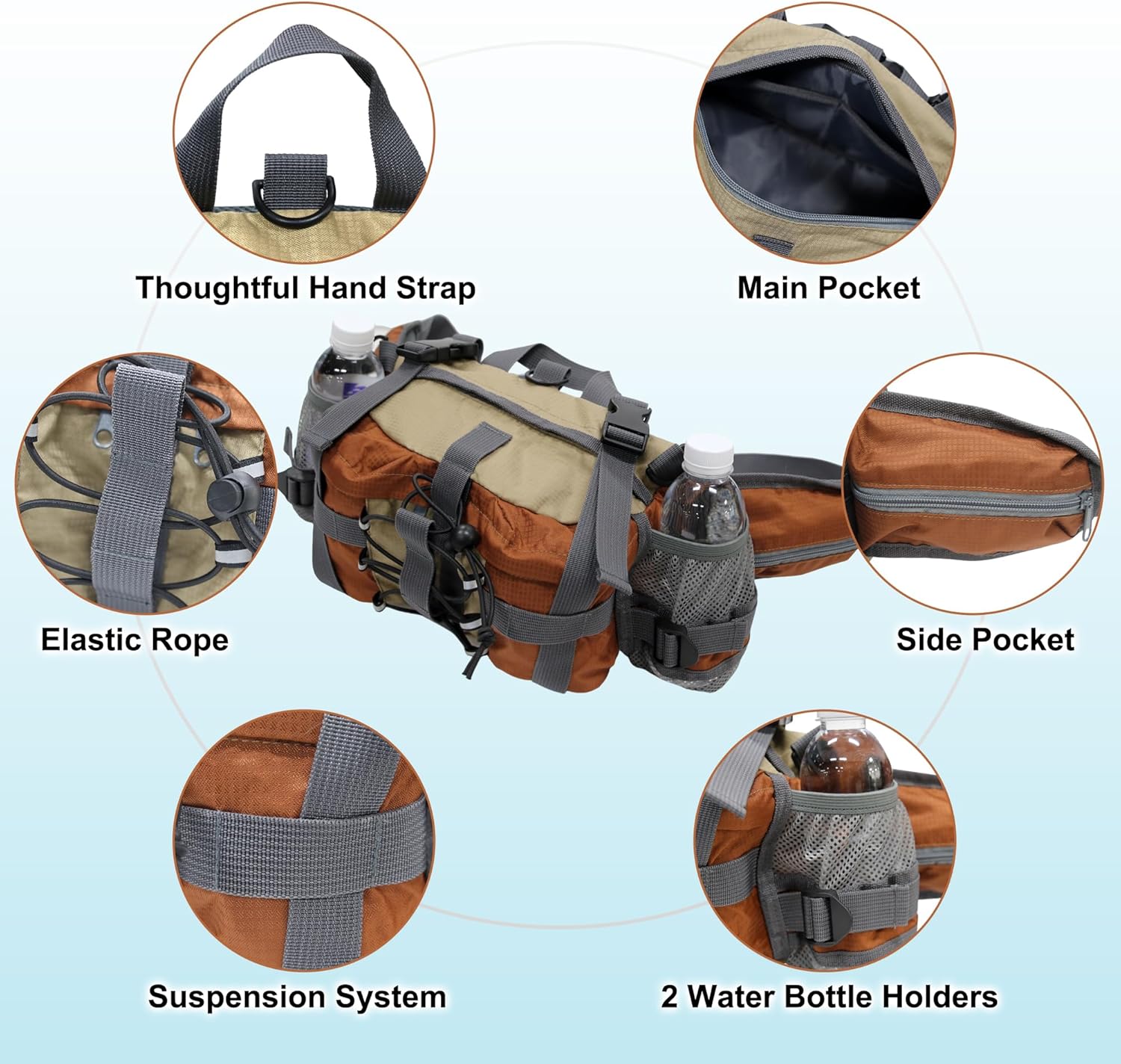 All-Day Carrying Comfort: Designed for long outings, three carrying options (lumbar support, shoulder carry, and backpack). Lightweight and practical outdoor waist packs can carry enough water and equipment to meet the needs of day hikes, camping, cycling, fishing and other activities.Note: Water bottle not included.