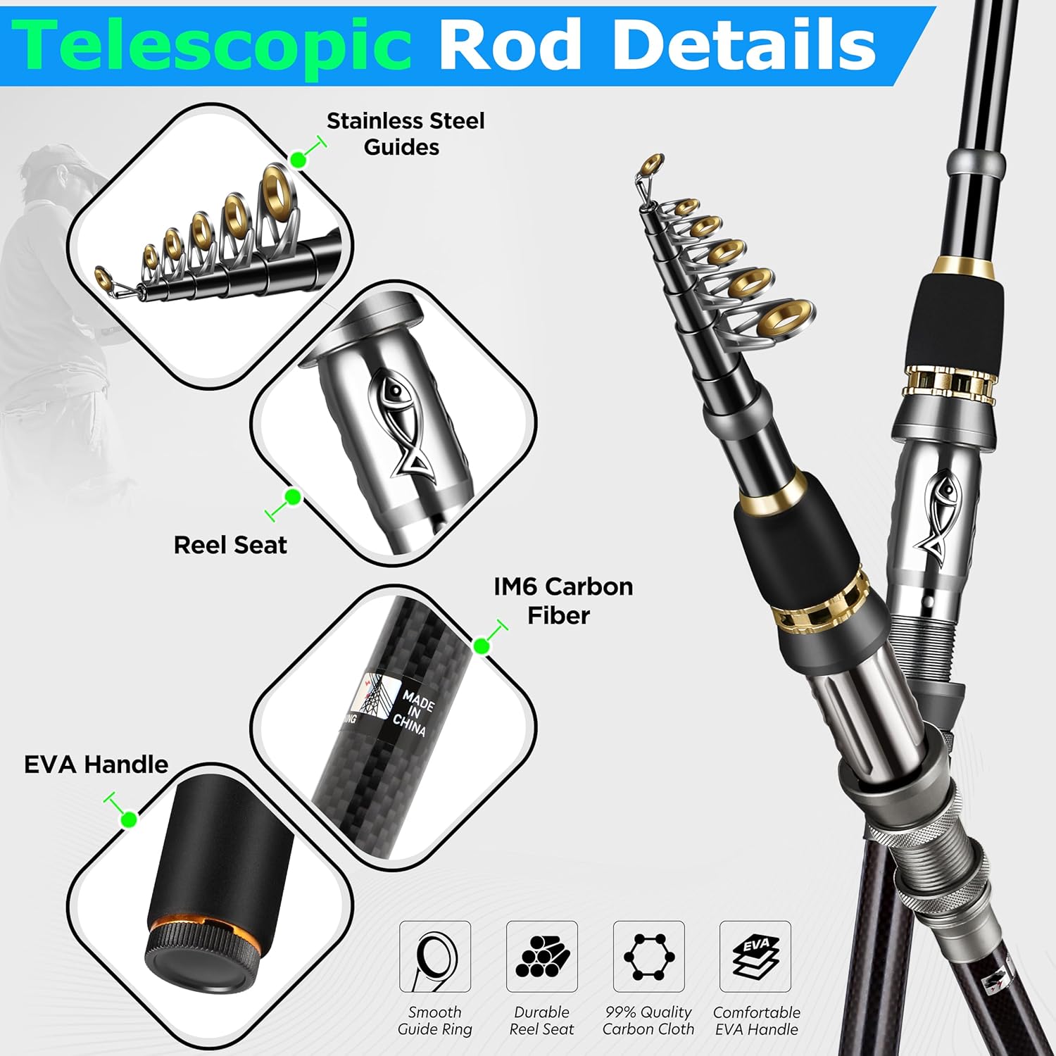 LIGHTWEIGHT AND SENSITIVE FISHING POLE – The PLUSINNO fishing poles and reels combo features sensitive and lightweight design, delivering exceptional value and performance for anglers. With perfect elasticity, high-density carbon fiber mixed with fiberglass makes the rod durable and resistant. The guide ring is made of ceramic, hard and light, and better heat dissipation. The collapsible telescoping fishing rod is portable, and its closed-length design makes it easy to carry. Action: Medium.