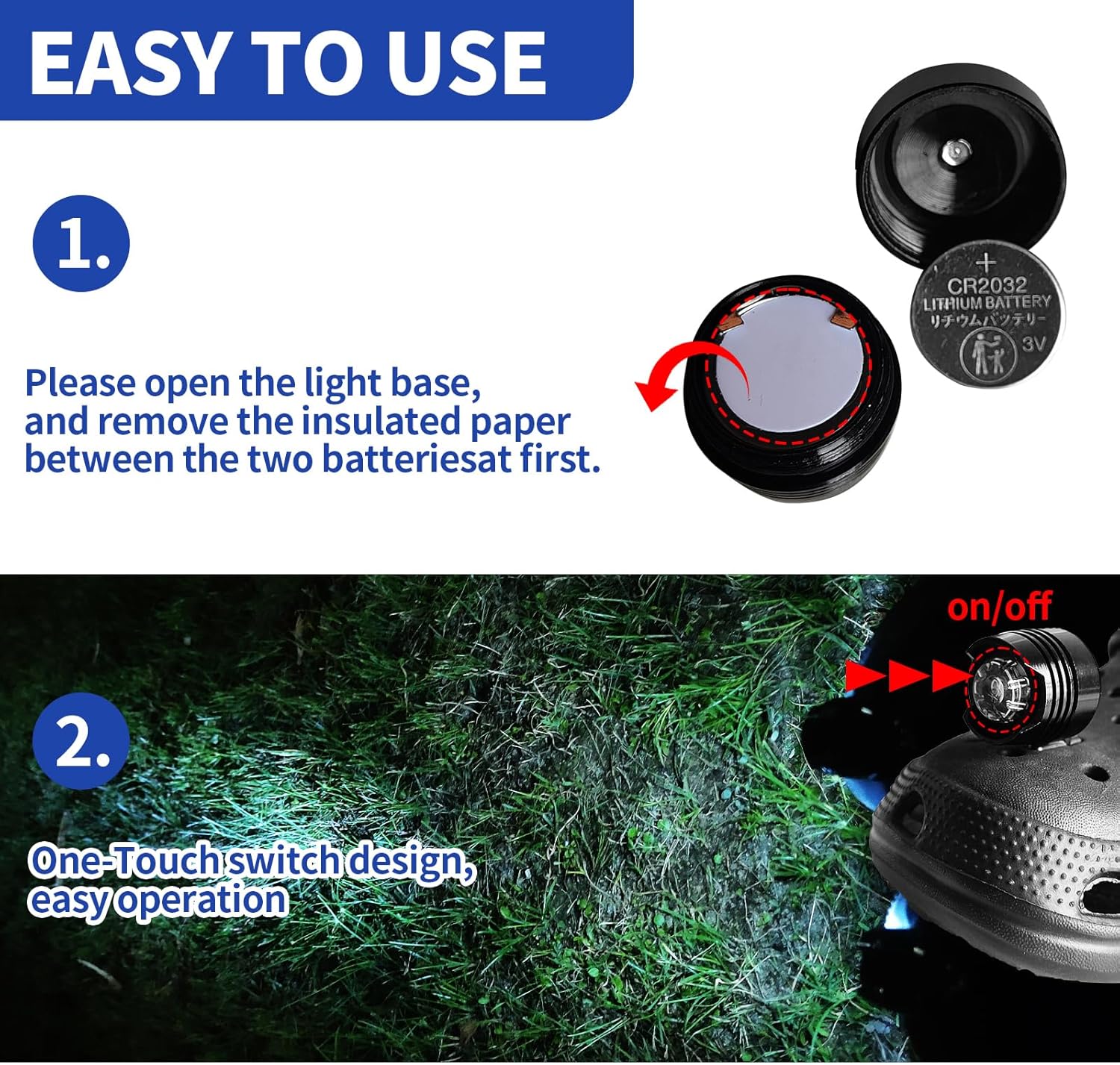 Our clog headlight is quick and easy to Install. This lights for shoes can work for 70 hours or more, and is super bright and durable.(Including 4 additional button batteries, totaling 8 batteries)