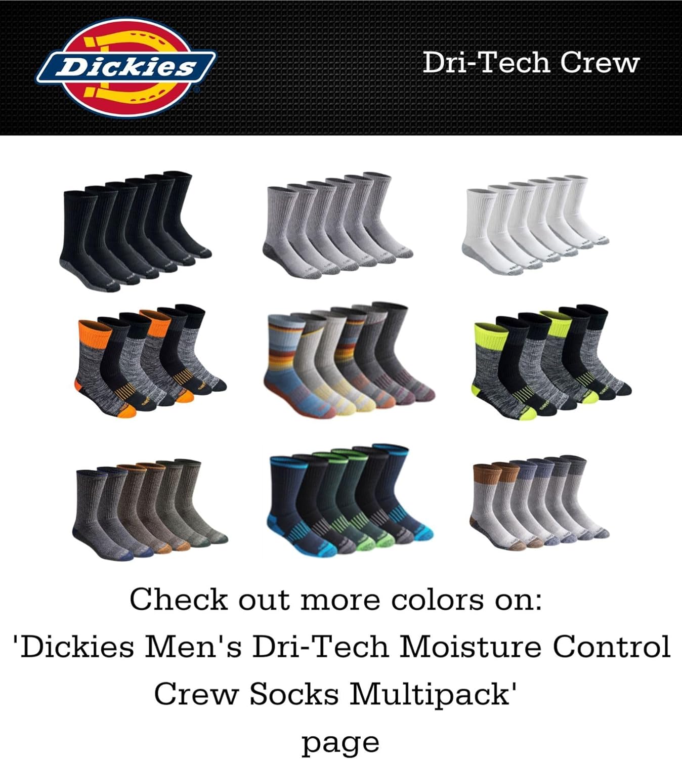Dickies dri-tech comfort 6 Pairs crew with wicking, moisture management fibers keeps feet dry, ventilation channels engineered for air circulation and moisture control, arch compression hugs feet and keeps socks in place, while providing in-step support, Reciprocated heel and toe for superior fit and full cushion comfort
