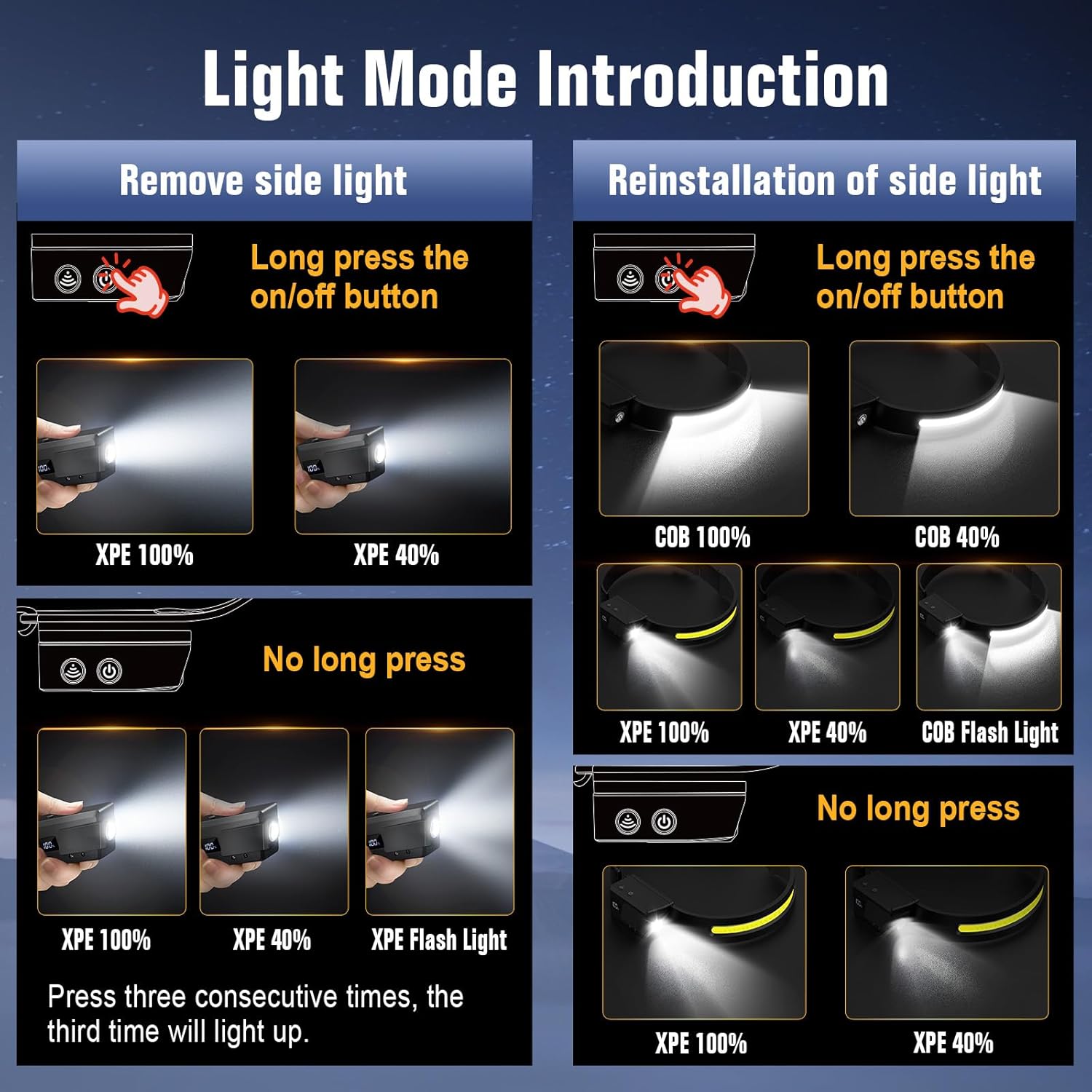 Motion Sensing & 5 Light Modes – The headlamp rechargeable has a sensitive smart sensor that allows you to turn it on or off with a wave of your hand as long as you are within 10cm of the device, truly enables hands-free operation. Press the power button to cycle through: COB light high, COB light low, XPE light high, XPE light low, Strobe Mode