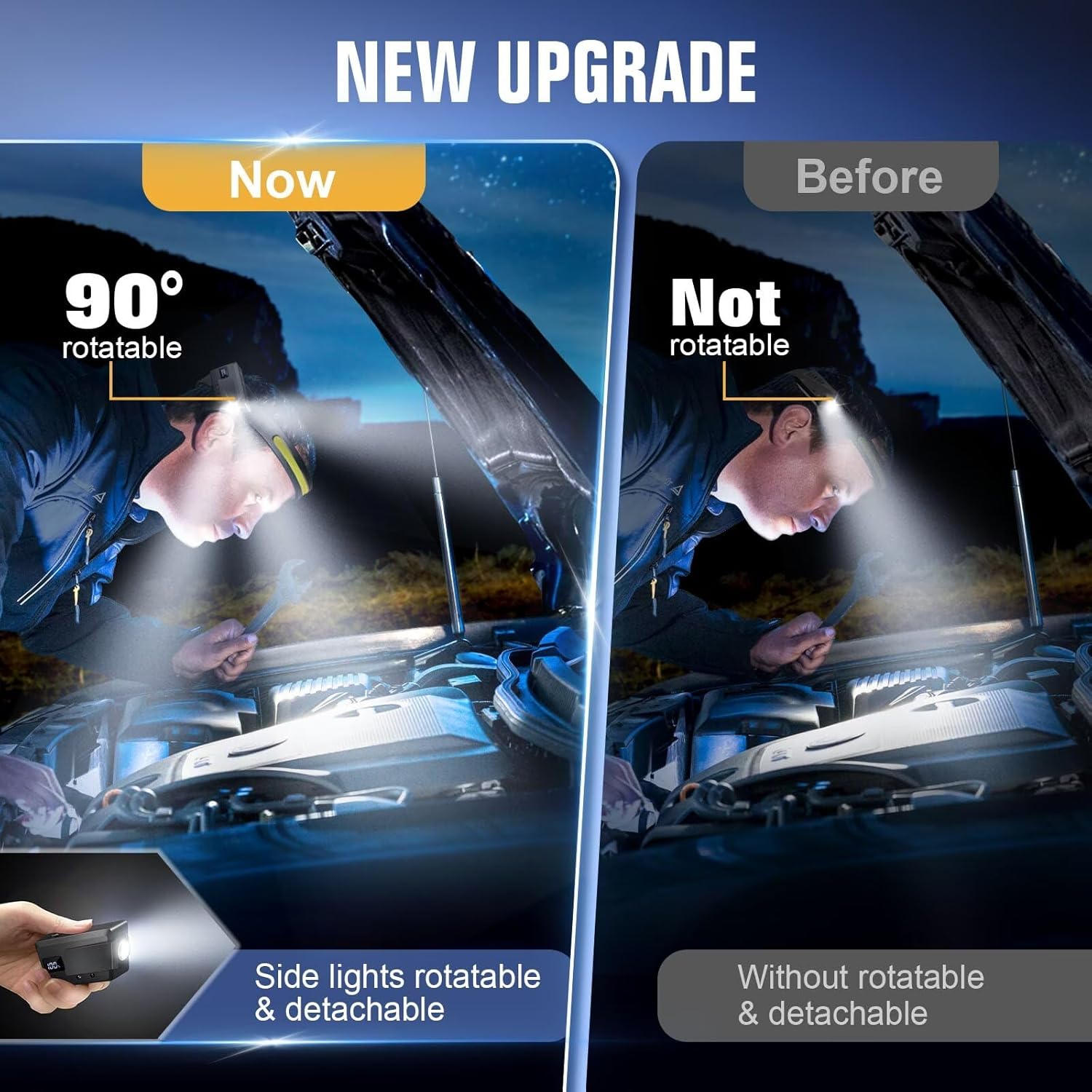 Rotatable & Removable – Upgraded head lamp features a spotlight that can be rotated 90° to meet your specific needs, allowing you to focus on a specific area. In the event of a power outage, the sidelight can be detached and used as an emergency torch. Tip: Purchase two rechargeable headlamps, the side light can be used as a battery backup