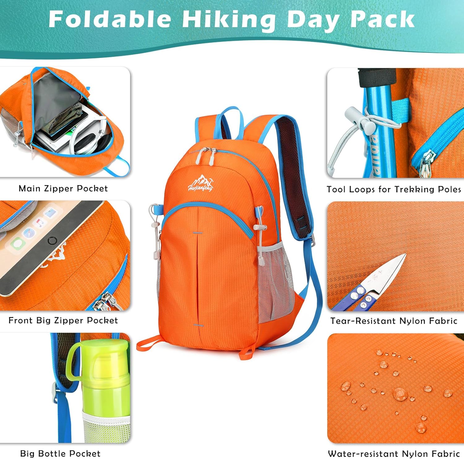 【Lightweight & Foldable】Lightweight travel backpack weighs only 0.47 lbs but has a capacity of 20 liters, ideal for adult hikers seeking minimalist gear for day trips. Save your to fold into 10.24″x5.9″x1.57″ compact pouch using built-in zippered pocket, effortlessly store in travel luggage as backup hiking backpack.