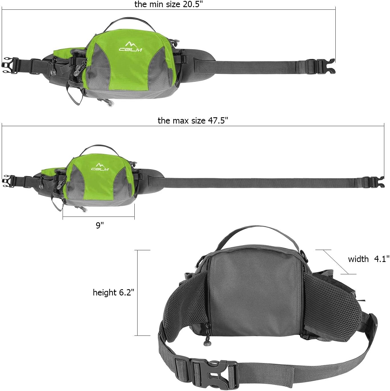 Waist Pack Size: 9″ 4.1″ 6.2″(L”W”H”)Adjustable Waist Belt: 20.5″-47.5″Water Bottle Holder: Maximum Diameter 3.5″Gender:Unisex