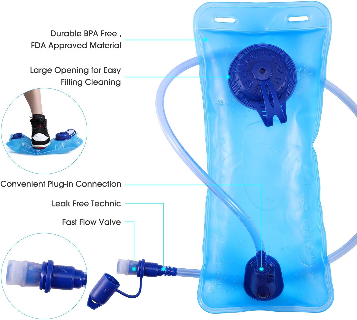【BPA-Free 2L HYDRATION BLADDER】 – Includes a 2-liter leak-proof water bladder with a soft, high-flow bite valve for easy drinking. Simply pull out the mouthpiece, bite to drink, and push it back to seal automatically. Our water bladder is pressure-tested and leak-proof, ensuring worry-free use during music festivals,cycling, running, hiking, and all outdoor adventures.