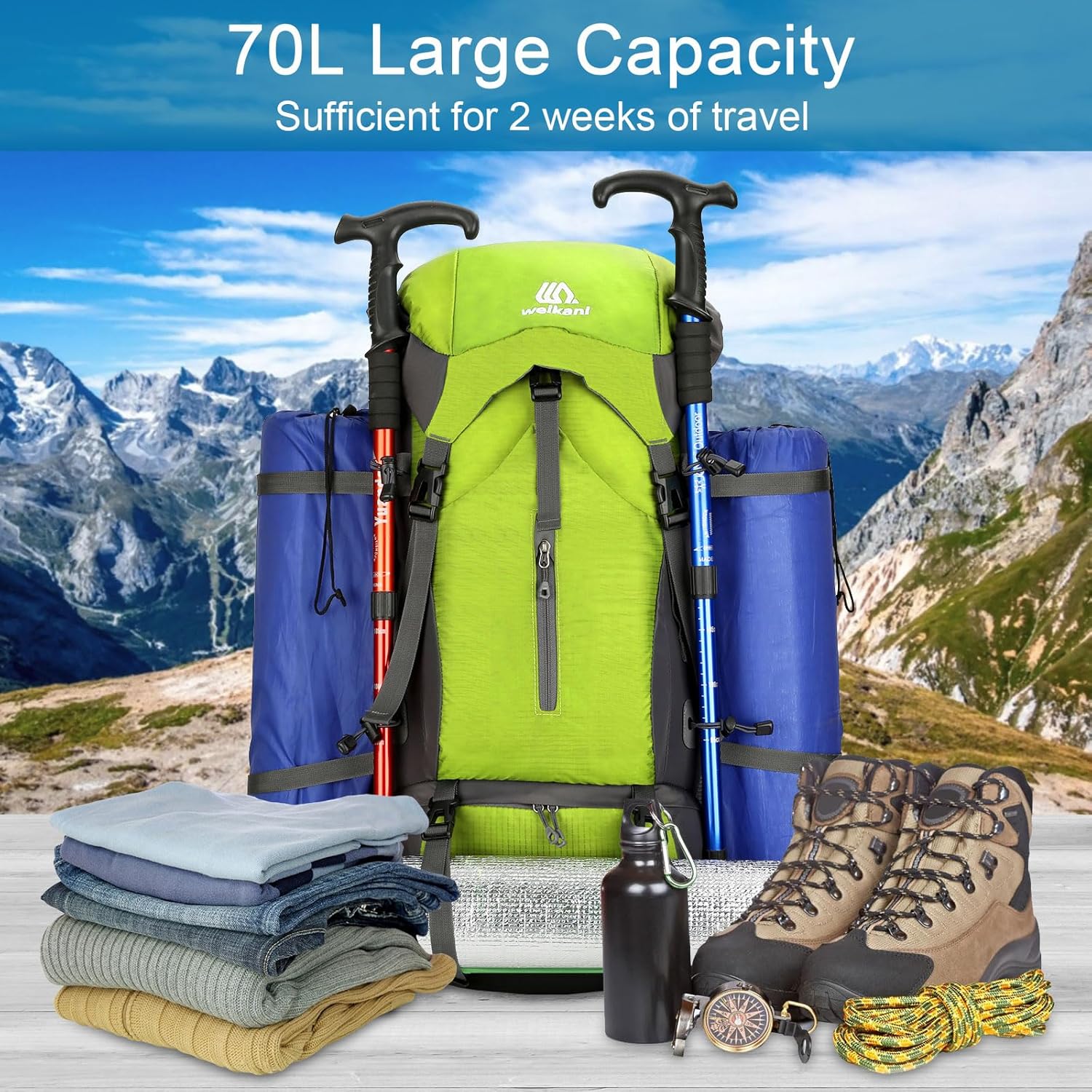 70L Expanded Capacity, Professional hiking backpack fits 3-5 days gear: easily carries tents (up to 3-person), sleeping bags, cooking kits + personal items. Multi-compartment design keeps equipment organized