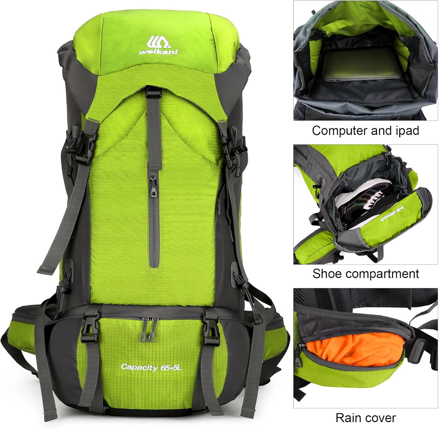 𝐖𝐚𝐭𝐞𝐫𝐩𝐫𝐨𝐨𝐟 & 𝐃𝐞𝐩𝐥𝐨𝐲𝐚𝐛𝐥𝐞 𝐑𝐚𝐢𝐧 𝐂𝐨𝐯𝐞𝐫: This waterproof hiking backpack comes with an easily deployable rain cover, stowed in the bottom compartment, ensuring your essentials stay dry during unexpected showers on your trek.70L waterproof and lightweight hiking backpack with shoulder phone pocket, and shoe compartments.