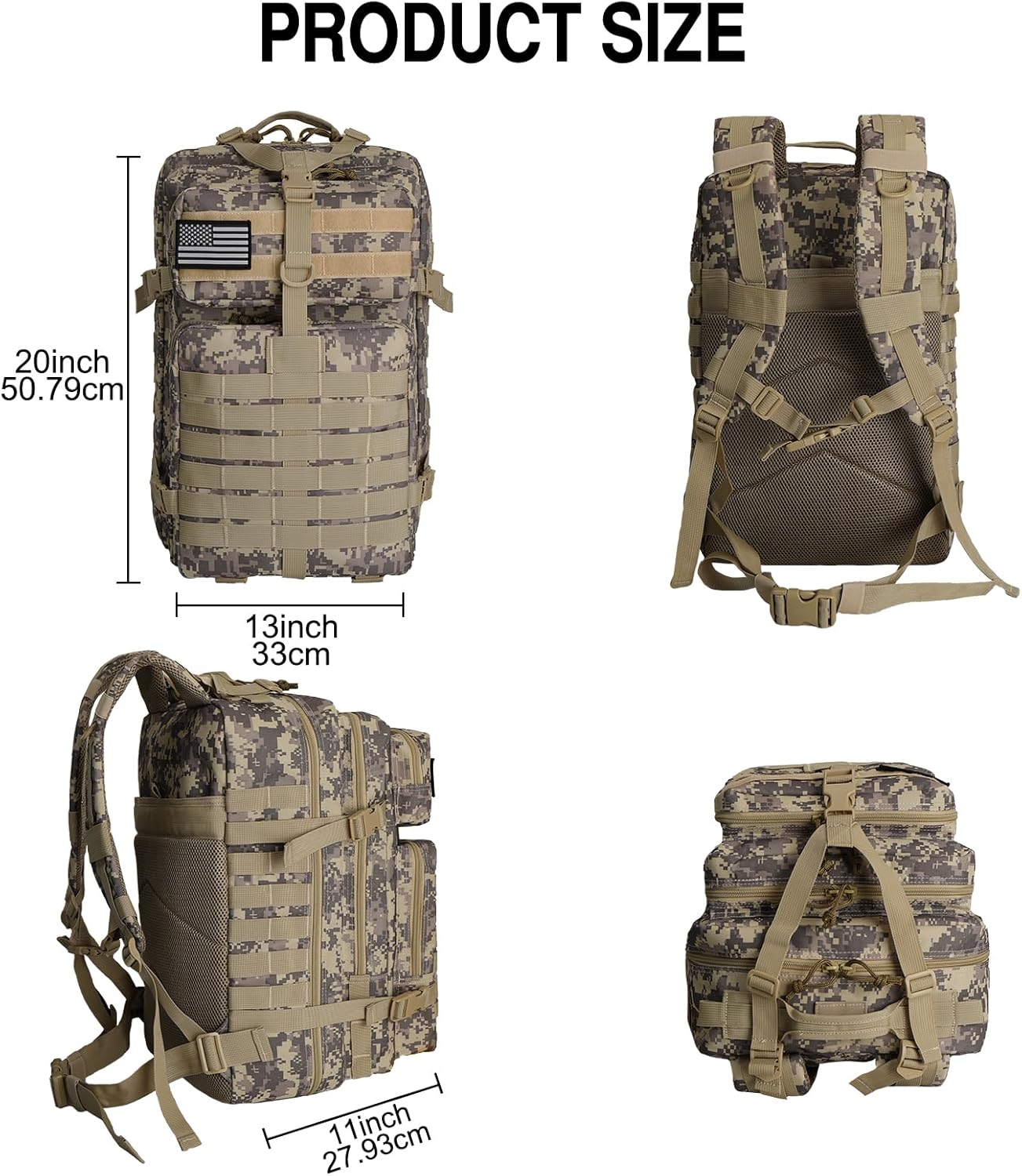 [LARGE CAPACITY]: The WOLT military backpack , measuring 13″x20″x11″ (50.5x33x28cm), offers a spacious 45L capacity. The heavy duty backpack is designed to securely carry all your essentials for activities such as hiking, camping, fishing, and gym workouts