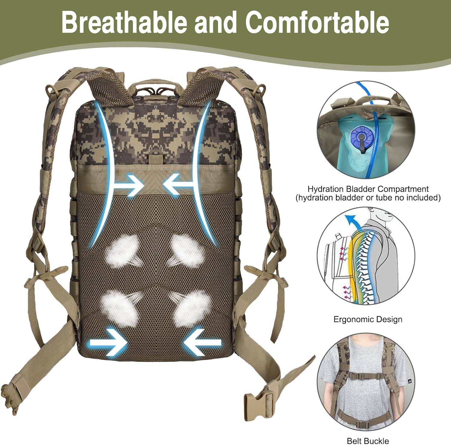[MULTI-FUNCTIONAL]: This utility backpack is hydration-compatible, ready to accommodate a hydration bladder (not included), ideal for camping, hiking, and other outdoor activities. It can also serve as a 3-day assault pack, survival kit, army bag, heavy duty backpack,bugout bag, trekking pack, range bag, or gym bag