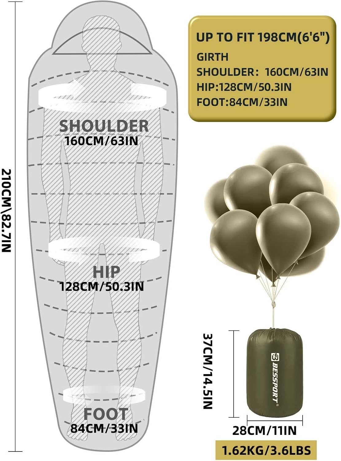 PRACTICAL COMPACT AND LIGHTWEIGHT DESIGN: Our sleeping bag is large enough to fit an adult 6’1″-6’6″. Girth of shoulder/ hip/ foot: 63″, 50.3″ 33″ nice for you comfortable sleeping. When folded and store in its carrying bag, the lightweight sleeping bag is easy to carry (1.62kg/3.6lbs).