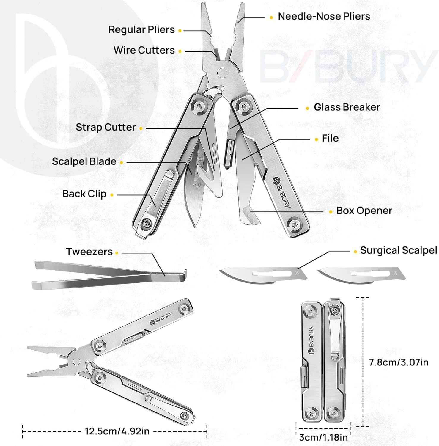 EDC Mini Multitool: BIBURY BI2051A mini multitools is designed as an EDC tool & Emergency gadget, it combine various functions for daily life and outdoor adventure: needle-nose pliers, regular pliers, wire cutters, window breaker, hook knife, file, replaceable scalpel blade, bottle opener, tweezers. Easily meet daily and outdoor needs, ensuring you are always ready for any emergency