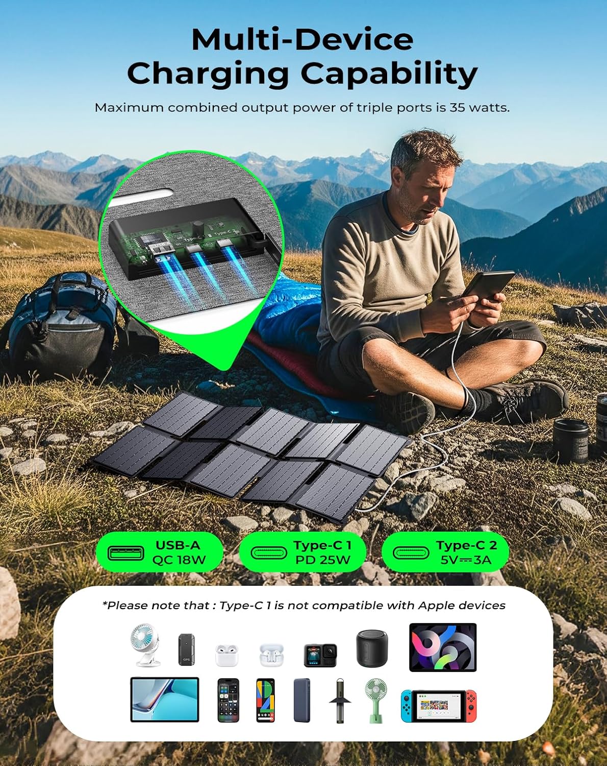 Power More Devices Anywhere: Features 2 Type-C ports and 1 USB-A port to charge a wide range of devices including Android/Apple phones, tablets, cameras, GPS units, and power banks(Type-C1 does not support Apple devices), BigBlue 35W solar panel charger ensures safer and more stable charging.