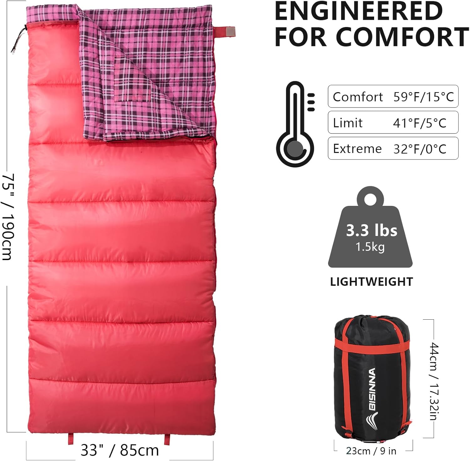 【High Quality Material】 BISINNA envelope sleeping bag covered with 190T tear-resistant polyester fabric which has excellent waterproof and windproof performance.Filling hollow fiber increase warmth and comfort. Lined with flannel lining which is soft, warm, comfortable and skin-friendly.Suitable for indoor and outdoor use, Perfect for camping hiking or car traveling