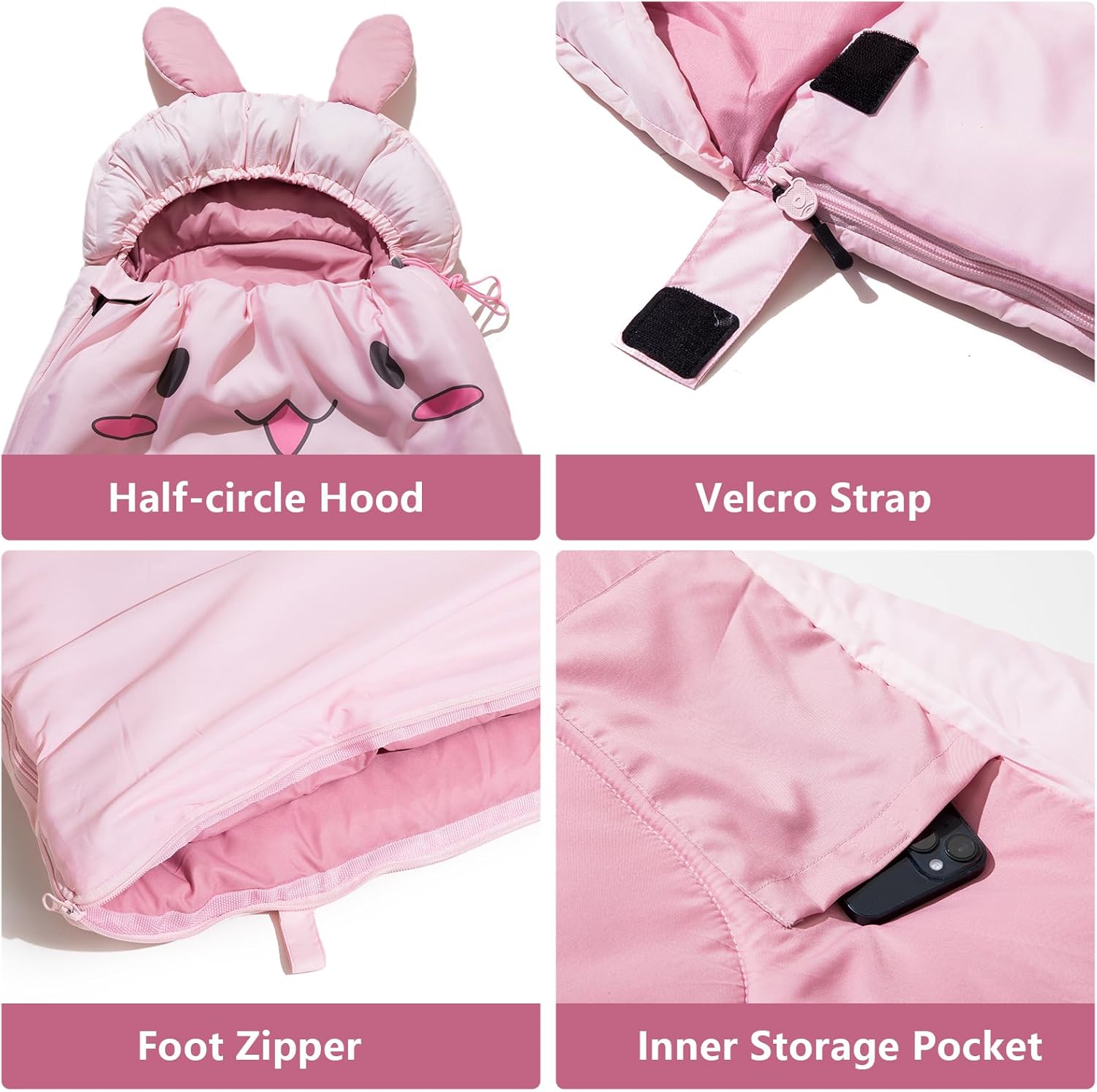 User-friendly design:This sleeping bag with a little pillow,more comfortable when sleeping,Two-way zipper is easy to pull back and forth.Can be fully opened to be a blanket for picnic or play. A separate zipper at the bottom allows the kids feet to stretch out freely in warm weather . A half-circle hood with an adjustable drawstring keeps head warmer even in extreme conditions