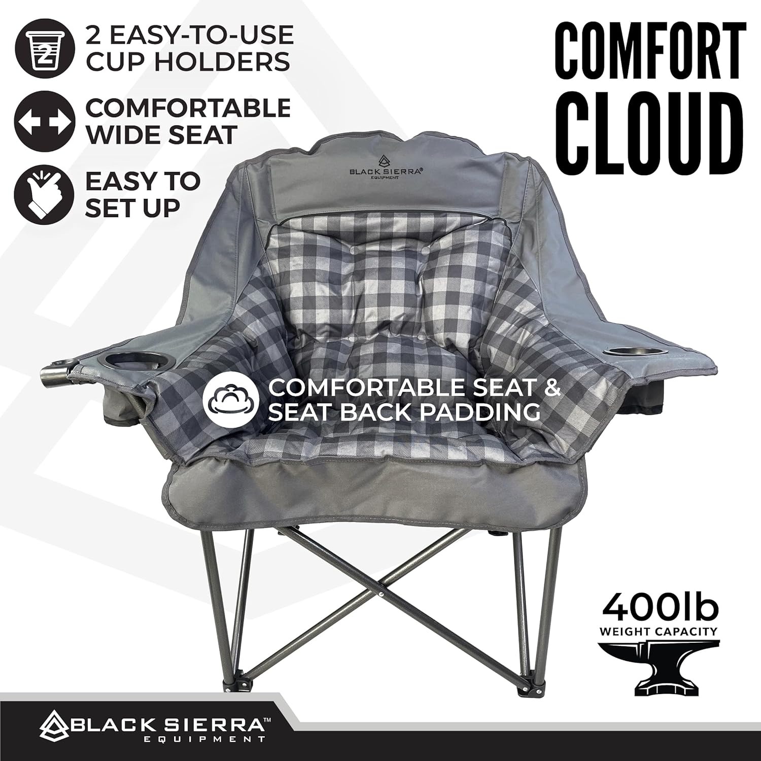 DESIGNED FOR THE OUTDOORS: Made with durable poly oxford. The heavy-duty Comfort Cloud chair ensures comfort while outdoors or on the sidelines.COMFORTABLE DESIGN: Padded seating and backrest offers all day comfort in the field or around basecamp, complete with convenient dual cup holders.LASTING SUPPORT: Heavy duty powder coated steel frame supports 400 lbs. This cushioned oversized chair measures 37.5” H, 40” L, 27.5” D when open.PORTABLE: This oversized chair only weighs 13 lbs. Carry bag included, making this chair perfect for easy transport while camping, hunting, hiking, or on sidelines.CONVENIENT: Easy to set up and take down. Quick folding capability makes this the perfect chair for any time you are on the go!