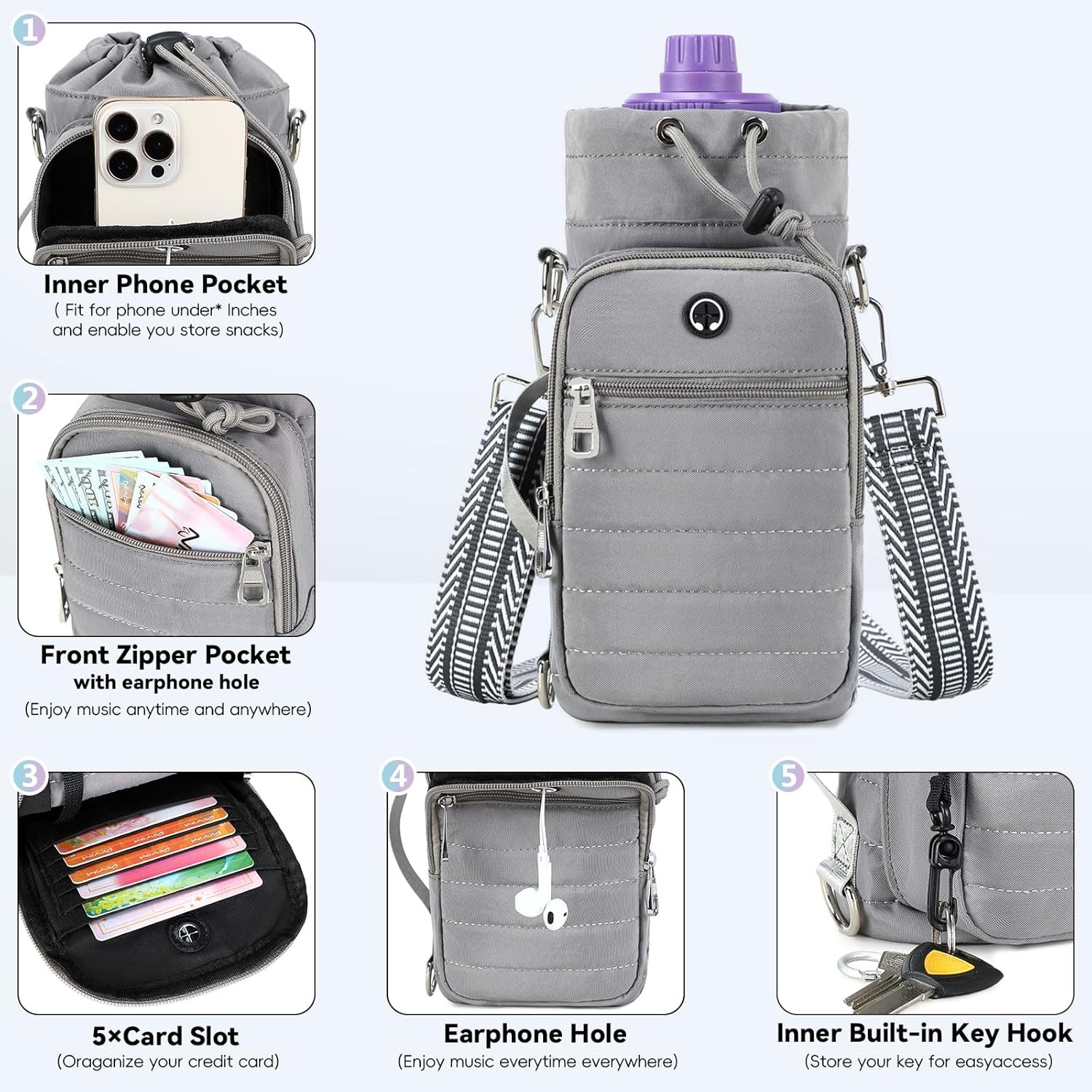 【Water Bottle Carrier Bag with Phone Pocket】Multiple Pockets + Small Wallet. The main pocket features a convenient drawstring closure to insert and remove your bottle. Designed with two zippered pocket , including a upgraded phone pocket while another zippered pocket &small wallet provide enough room for little stuff as cash, ID, credit card, work badge, coin, lipstick and some other small things