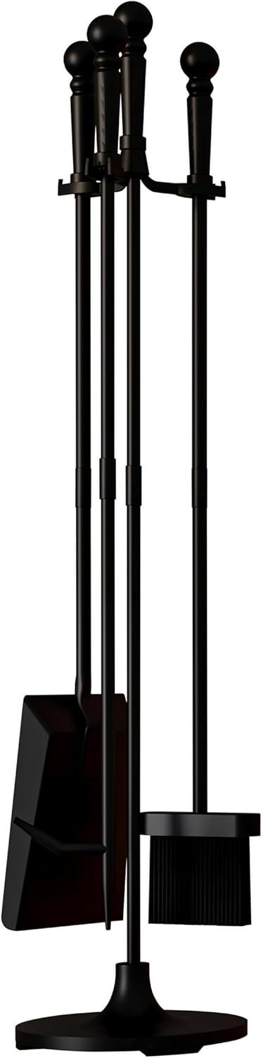 4 PCS Combination of Fireplace Tools:30 inch height fireplace tool holder adopts a heavy duty circular cast iron base for stability.The top support of tools set can not only Keep fireplace Brush,Shovel,Poker neatly fixed,but also saves space and tidy storage,bid farewell to messy.Integrated appearance brings decoration and beauty.