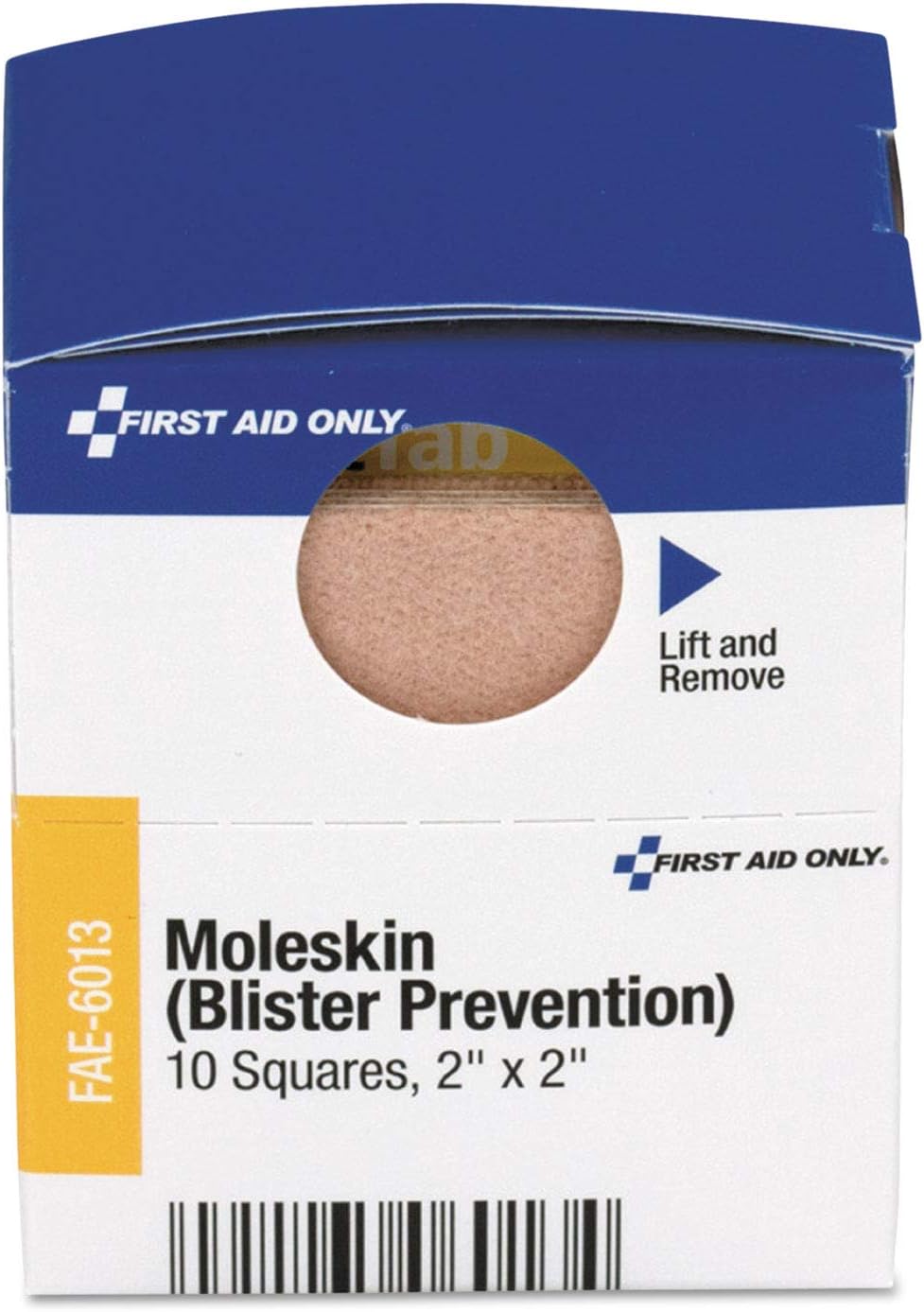 SmartCompliance Refill with 10, 2″ x 2″ Moleskin Blister Prevention squares per box. The moleskin squares are made out of premium-grade material and can be cut to fit any specific need. The flexible material conforms to all contours, staying securely in place to help prevent the development of blisters. The moleskin cushions against friction and pressure. The refill is used in First Aid Only SmartCompliance cabinets: 90660, 746004, 746006, 1001-FAE-0103 and 1301-FAE-0103.