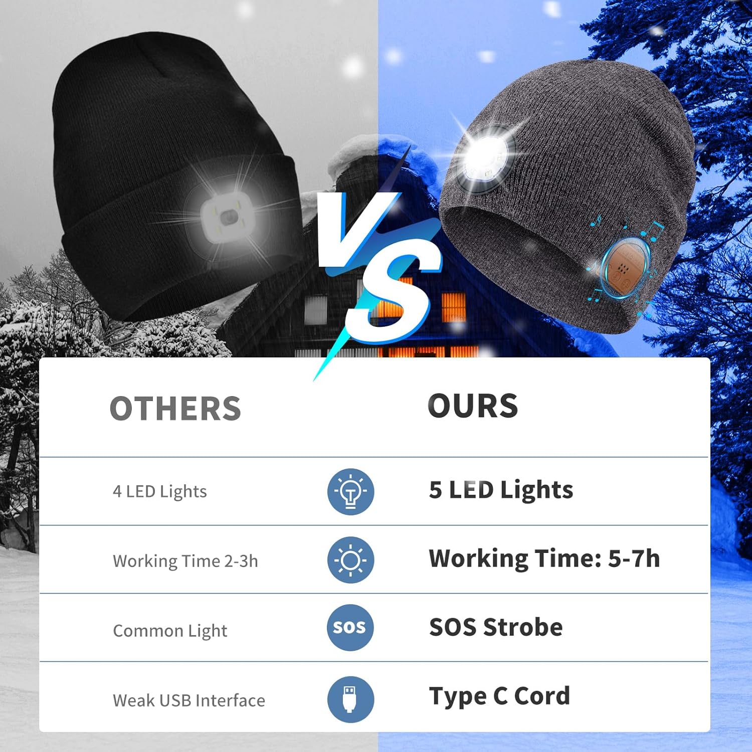 Beanie with Light and Bluetooth Headphones, Rechargeable &Removable