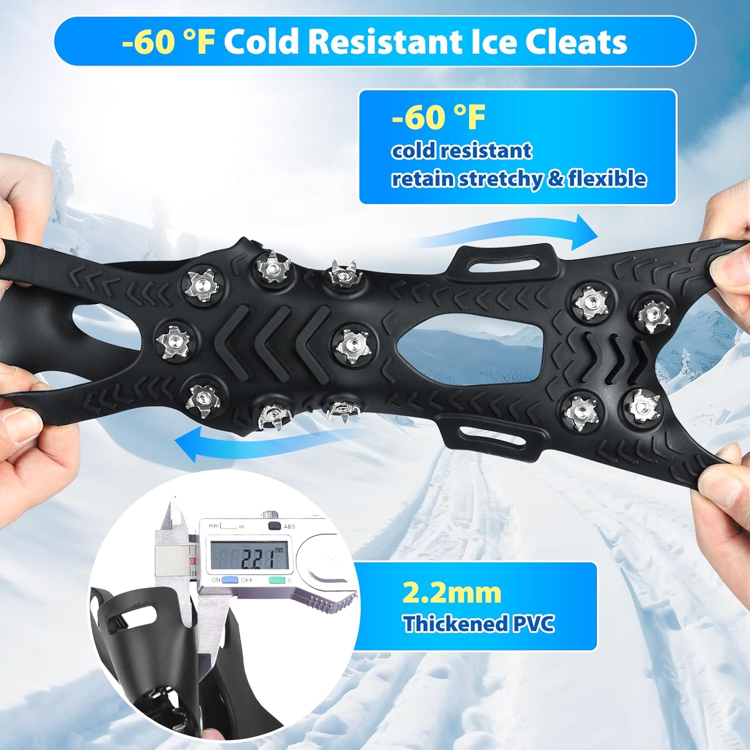 Upgraded Crampons with built-in spacers deliver superior traction on ice. These ice cleats are engineered with 2.2mm thickened cold-resistant silicone and 304 stainless steel spikes. Designed for exceptional durability and flexibility, they retain high elasticity even in extreme cold as low as -60°F