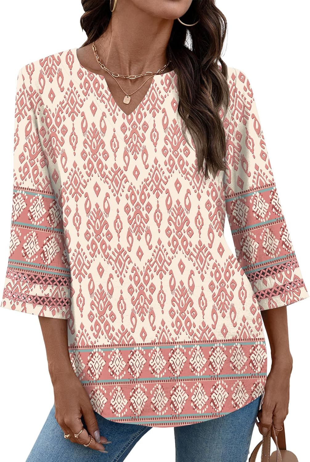 Womens 3/4 Sleeve Top Boho Shirts for Women Vneck Tshirts Shirts Trendy Tops