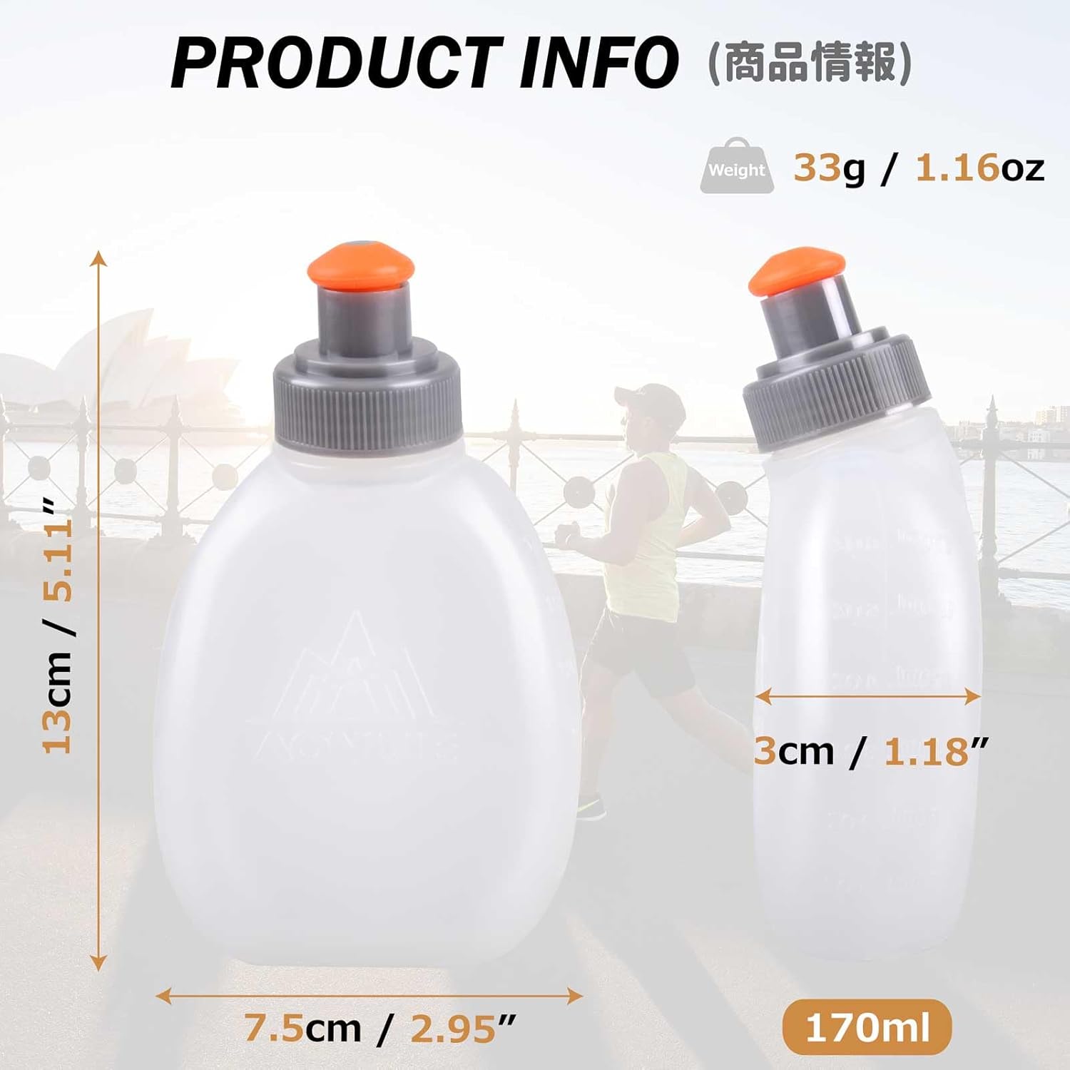 Lightweight and Compact: The 170ml handheld bottle weighs only 33g (1.16 oz), the 250ml bottle 38g (1.34 oz), and the 280ml bottle 40g (1.41 oz). Its compact size makes it easy to hold and convenient to carry in your backpack or pocket